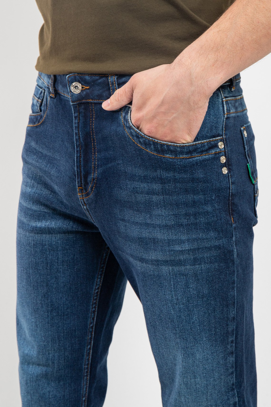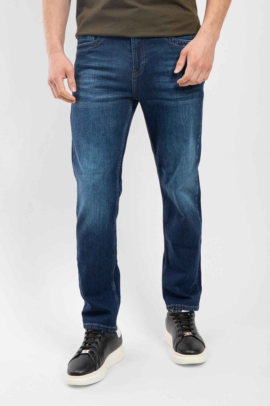 Мужские темно-синие джинсы из хлопкового микса от Bikkembergs (Биккембергс). Полная длина, средняя посадка, застежка на молнию и пуговицу, пять карманов, петли в поясе для ремня. Размер вещи на фото: 32