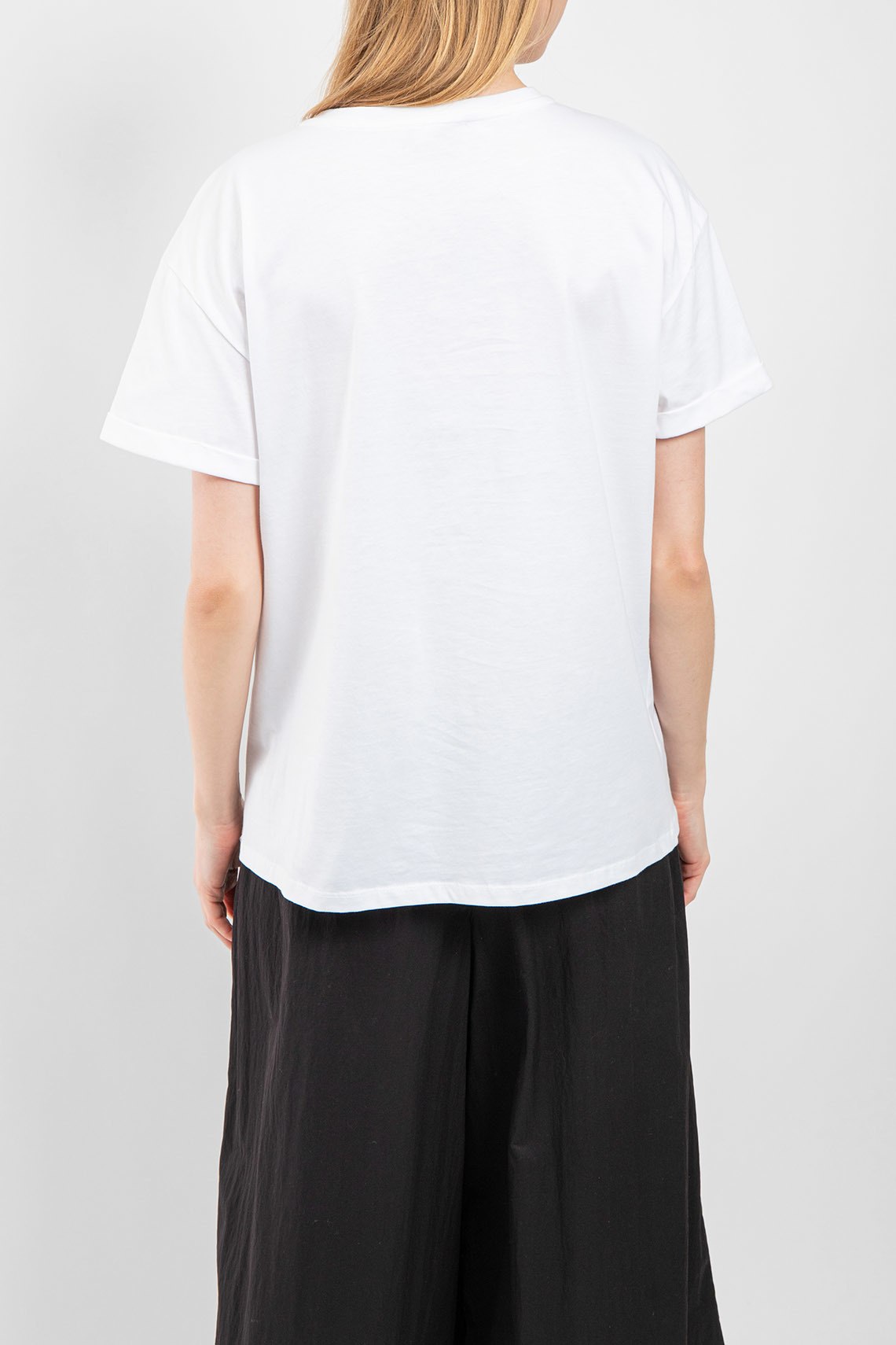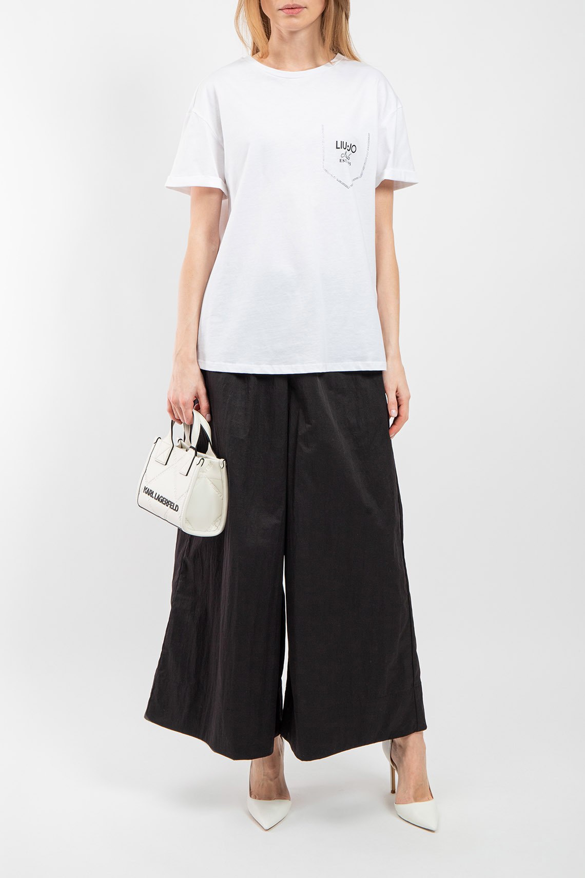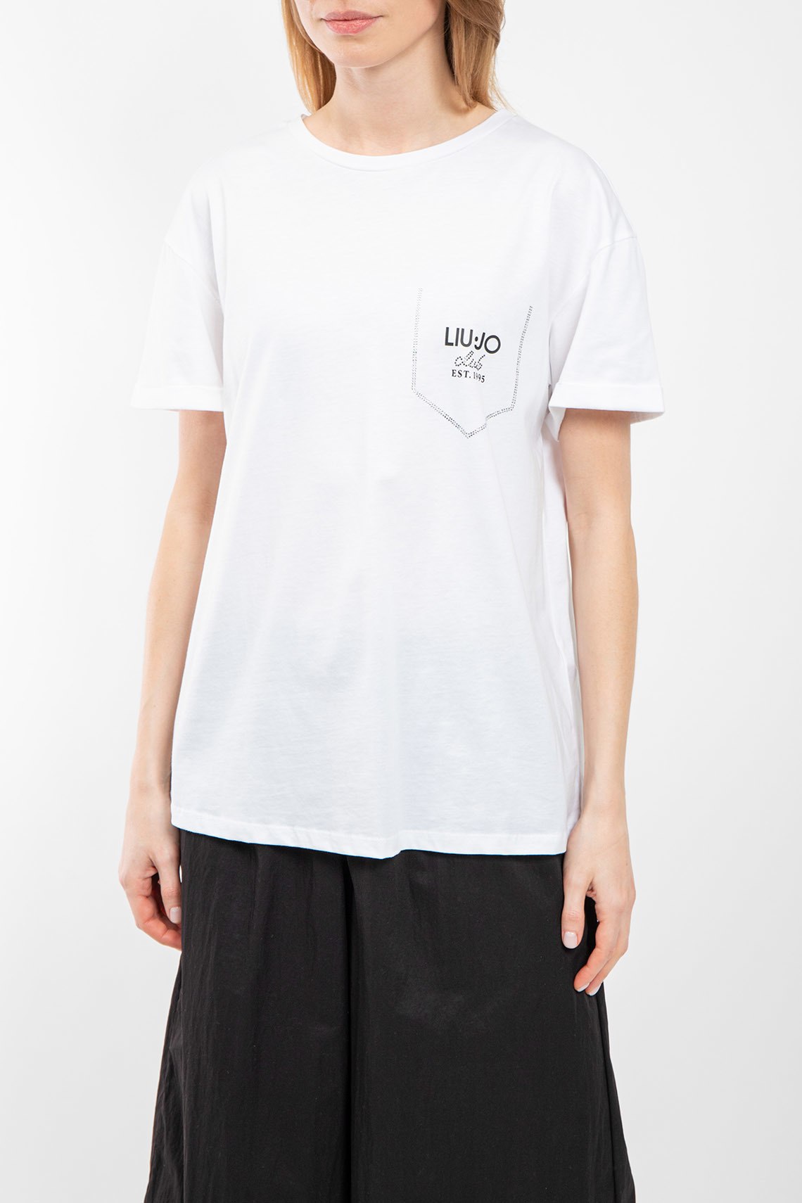 Женская белая футболка из хлопка от Liu Jo (Лиу Джо). Классическая длина, круглый вырез горловины, короткие рукава, брендированный логотип бренда на груди с аппликацией из кристаллов. Измерения на размер М: Длина изделия - 64 см, плечи - 50,5 см, полу обхват груди - 53 см, полу обхват талии - 56 см, длина рукава по внутреннему шву - 6 см, длина рукава по внешнему шву - 14 см, ширина рукава - 18 см
