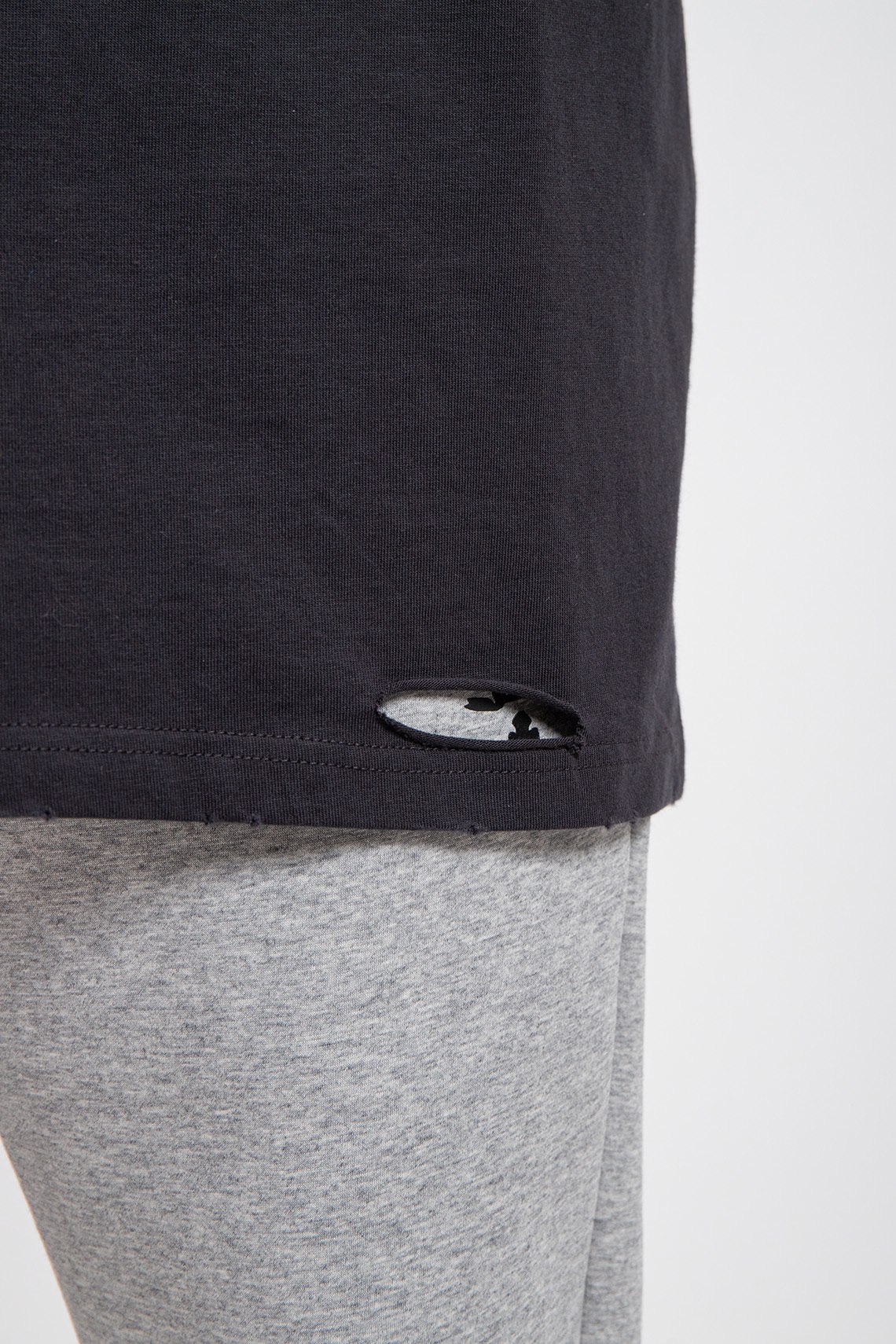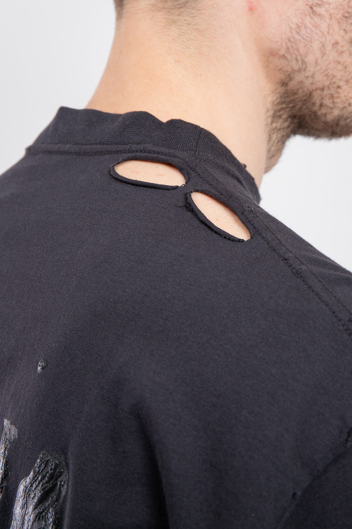 Мужская черная футболка из хлопка от Balenciaga (Баленсиага). Классическая длина, круглый вырез горловины, коротки рукава декоративные прорези, графический принт на спине