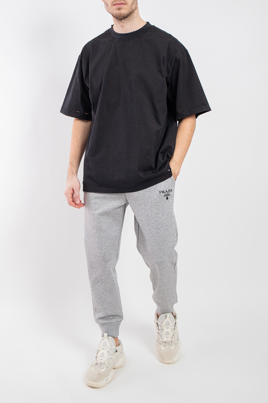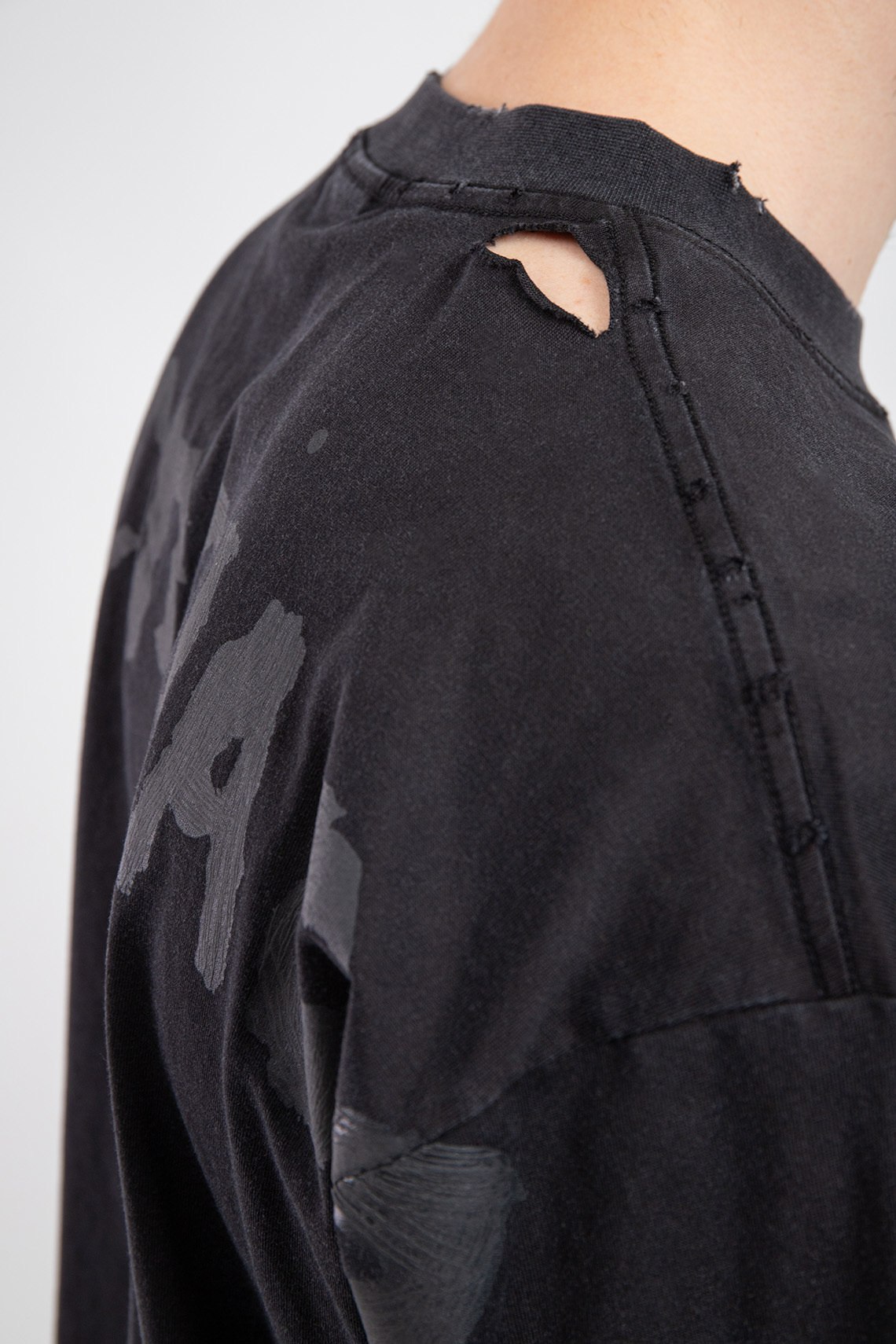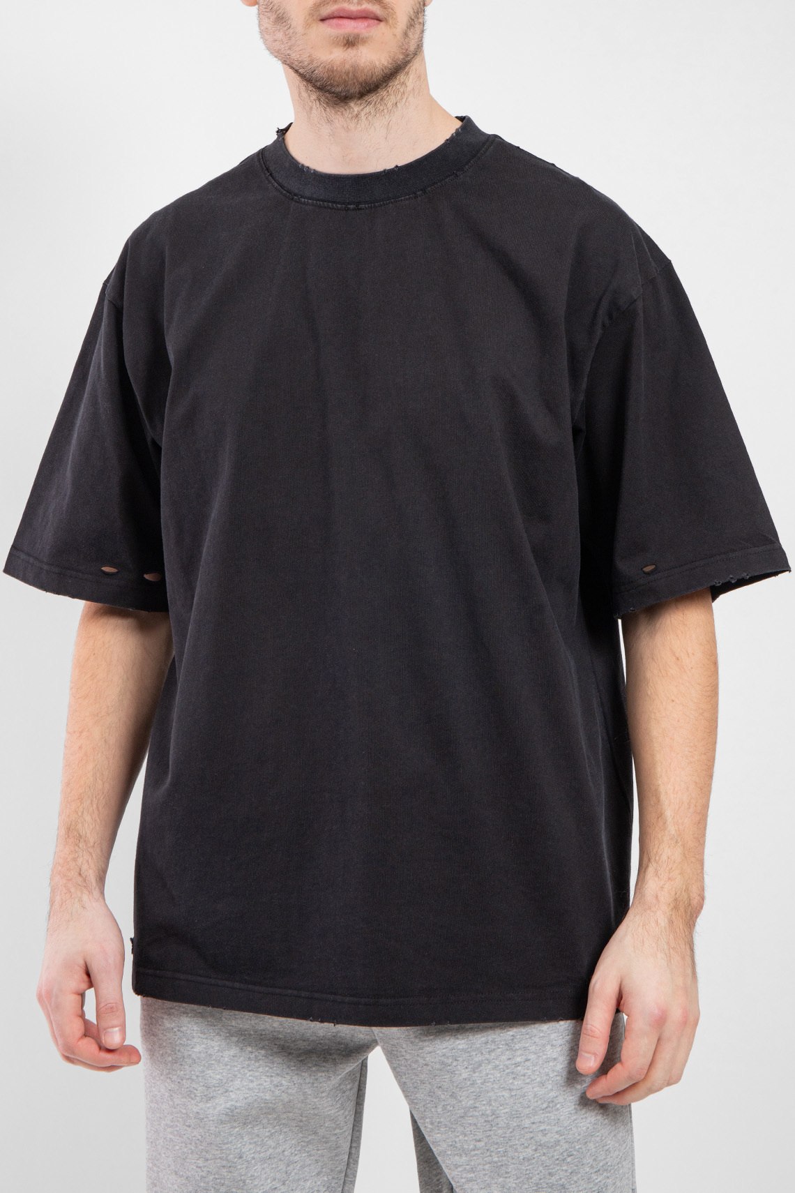 Мужская черная футболка из хлопка от Balenciaga (Баленсиага). Классическая длина, круглый вырез горловины, коротки рукава декоративные прорези, графический принт на спине