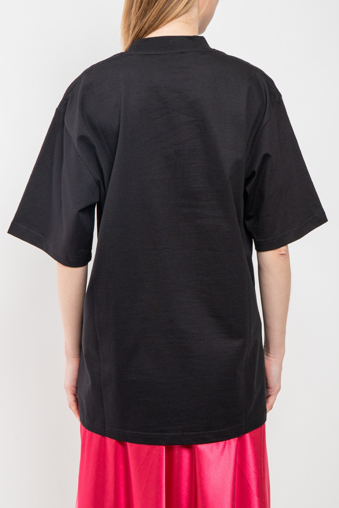 Женская черная хлопковая футболка от Balenciaga (Баленсиага). Логотип на груди, круглый вырез горловины, фасон oversize, короткий рукав, удлиненная длина