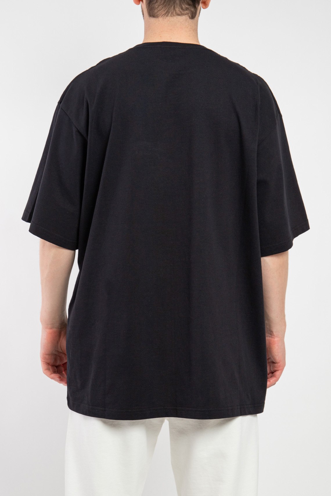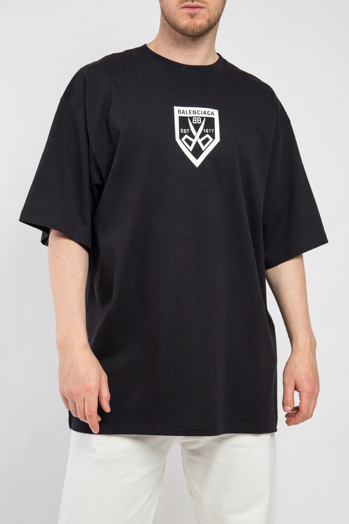 Мужская черная хлопковая футболка от Balenciaga (Баленсиага). Фасон oversize, принт с логотипом на груди, круглый вырез горловины, короткий рукав, удлиненная длина