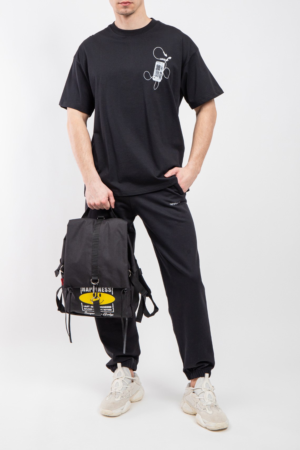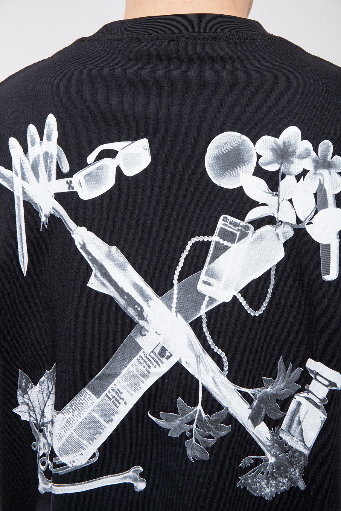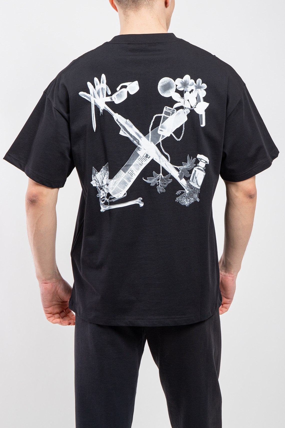 Мужская черная футболка Scan Arrow из хлопка от Off-White (Офф-Вайт). Классическая длина, круглый вырез горловины ,короткие рукава, модель декорирована принтом на груди и на спине