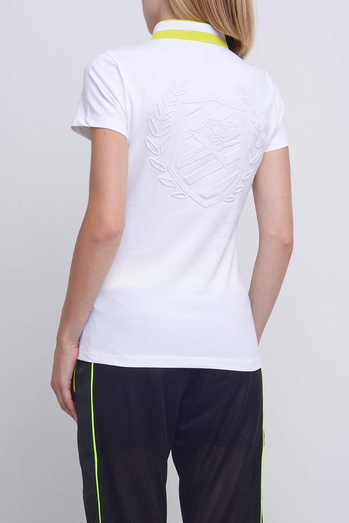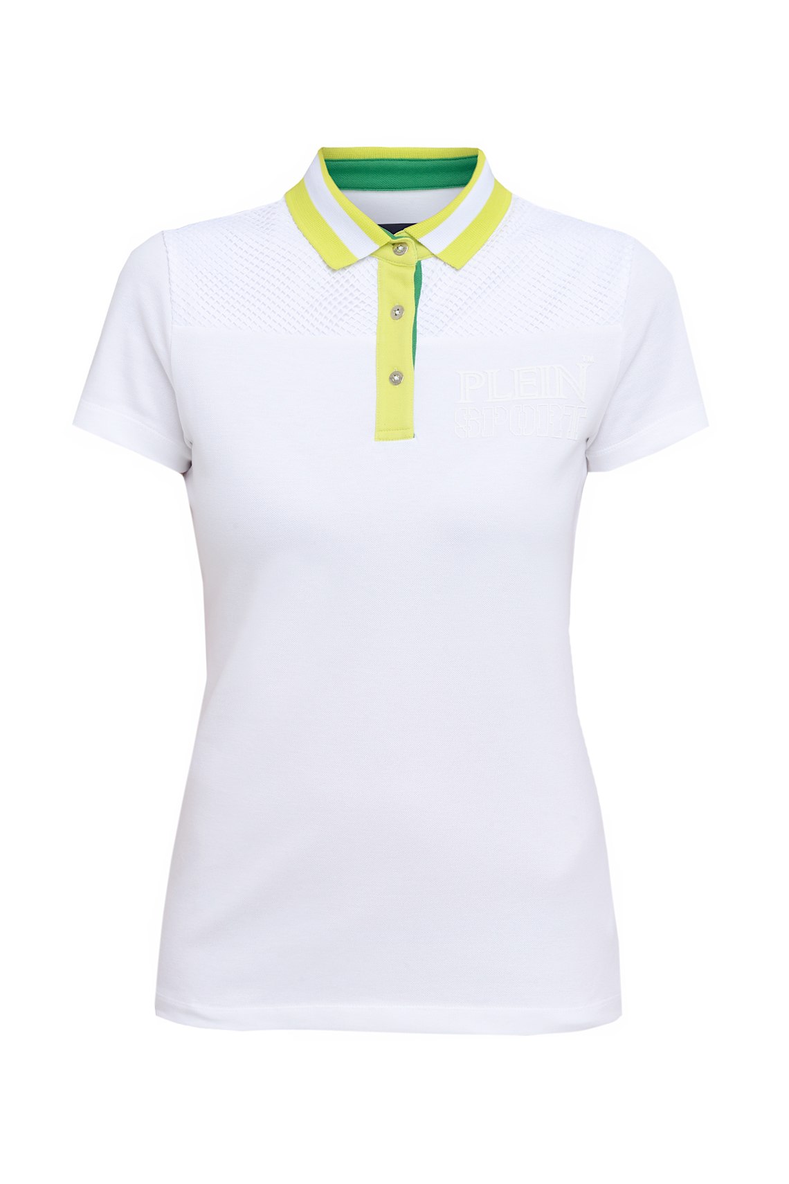 Белая футболка-поло из хлопкового микса "Logos" от Plein Sport. Принты логотипа спереди и сзади, трикотажный воротник на пуговицах, короткий рукав. Размер вещи на фото: S