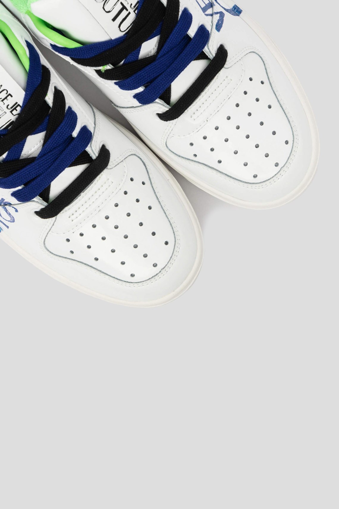 Мужские белые кожаные кеды Starlight от Versace (Версаче). Модель из гладкой кожи, принт с логотипом сбоку и на язычке, классическая шнуровка, закругленный носок, резиновая подошва