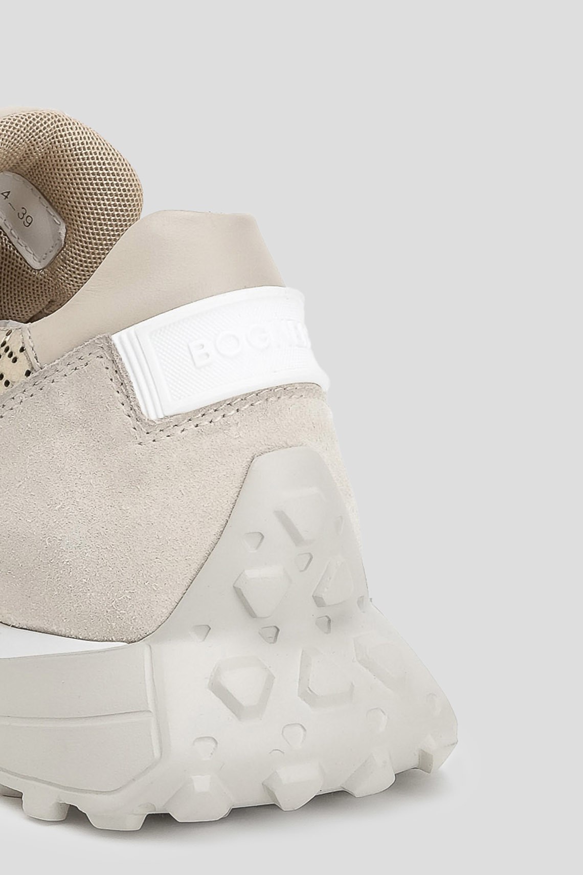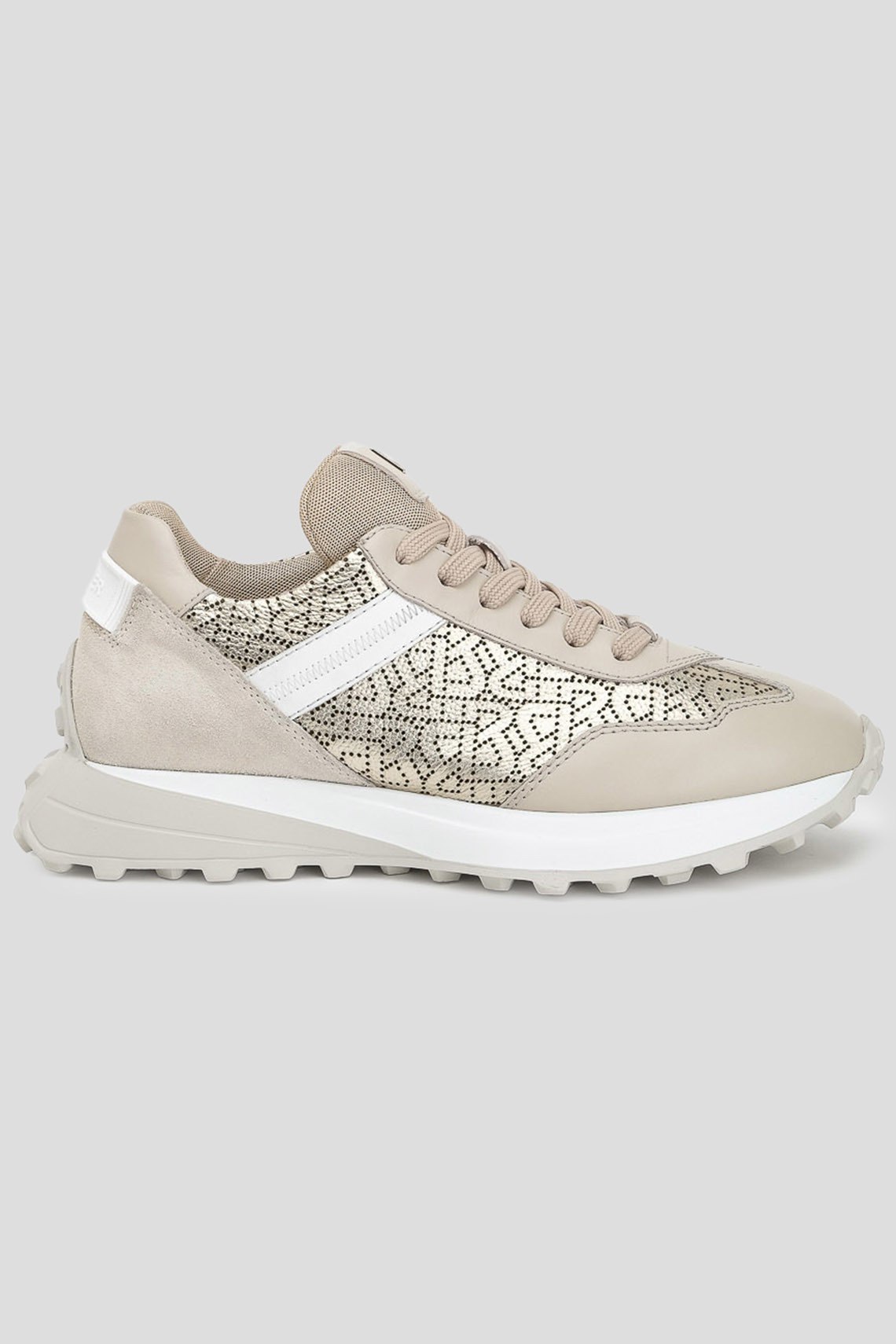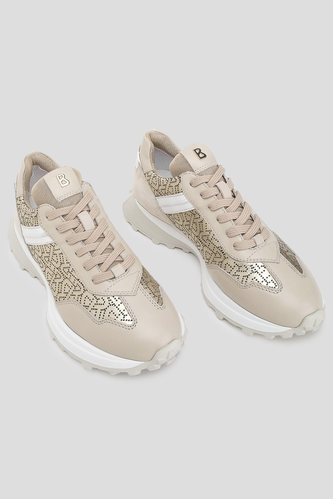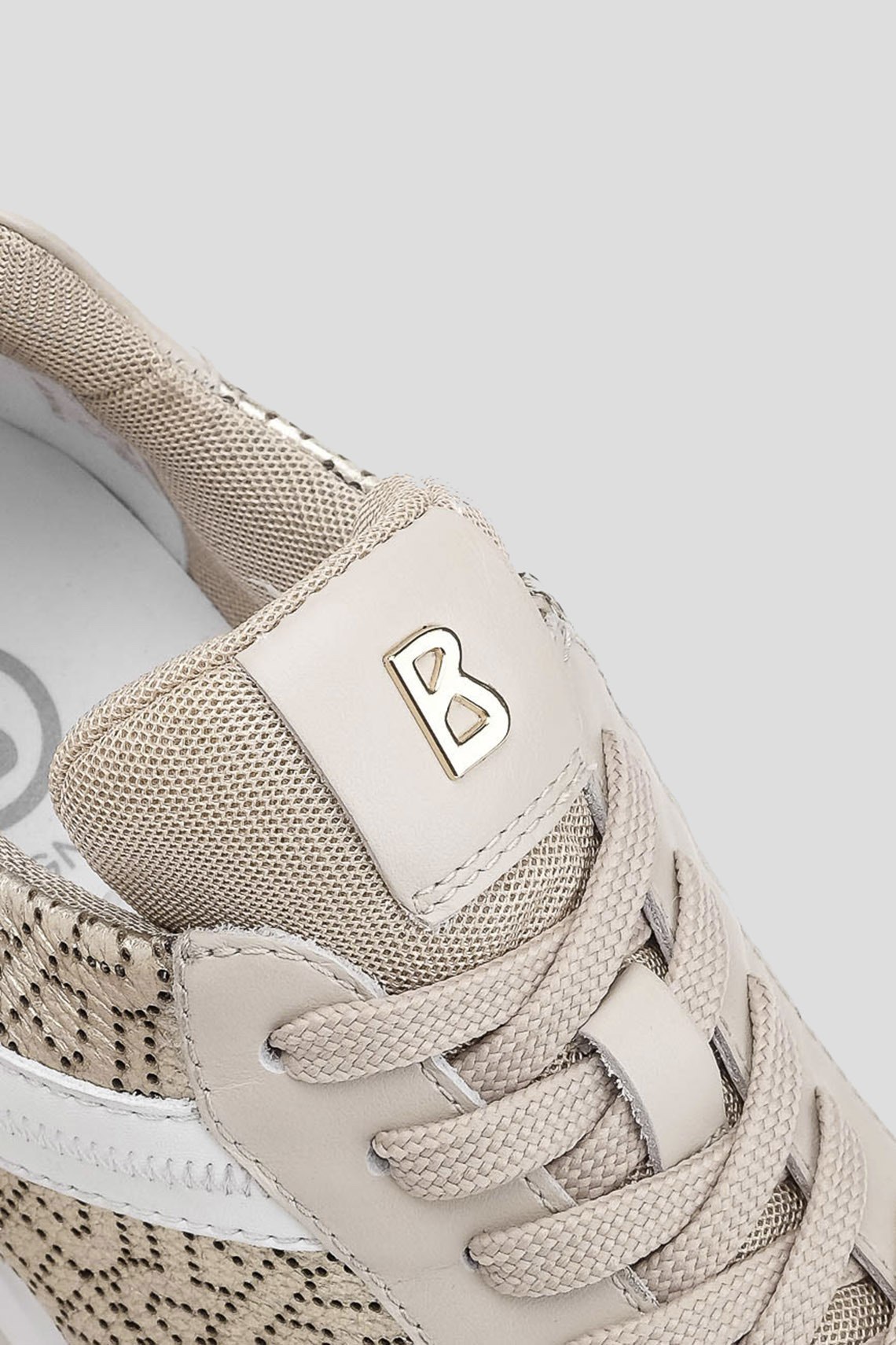 Женские золотисто-бежевые кроссовки из кожи и замши Charlotte от Bogner (Богнер). Комбинация цветов и материалов, перфорированная монограмма, логотип ня пятке и на язычке, классическая шнуровка, закругленный носок, бело-бежевая подошва