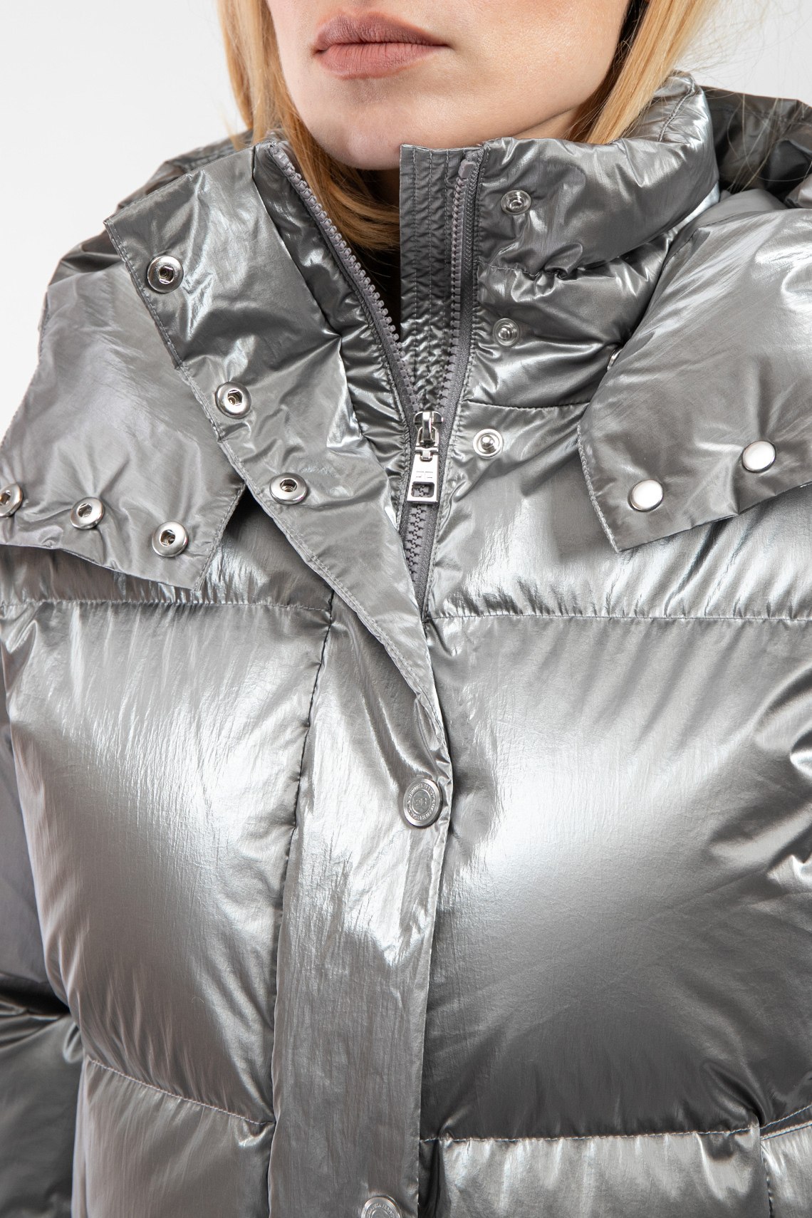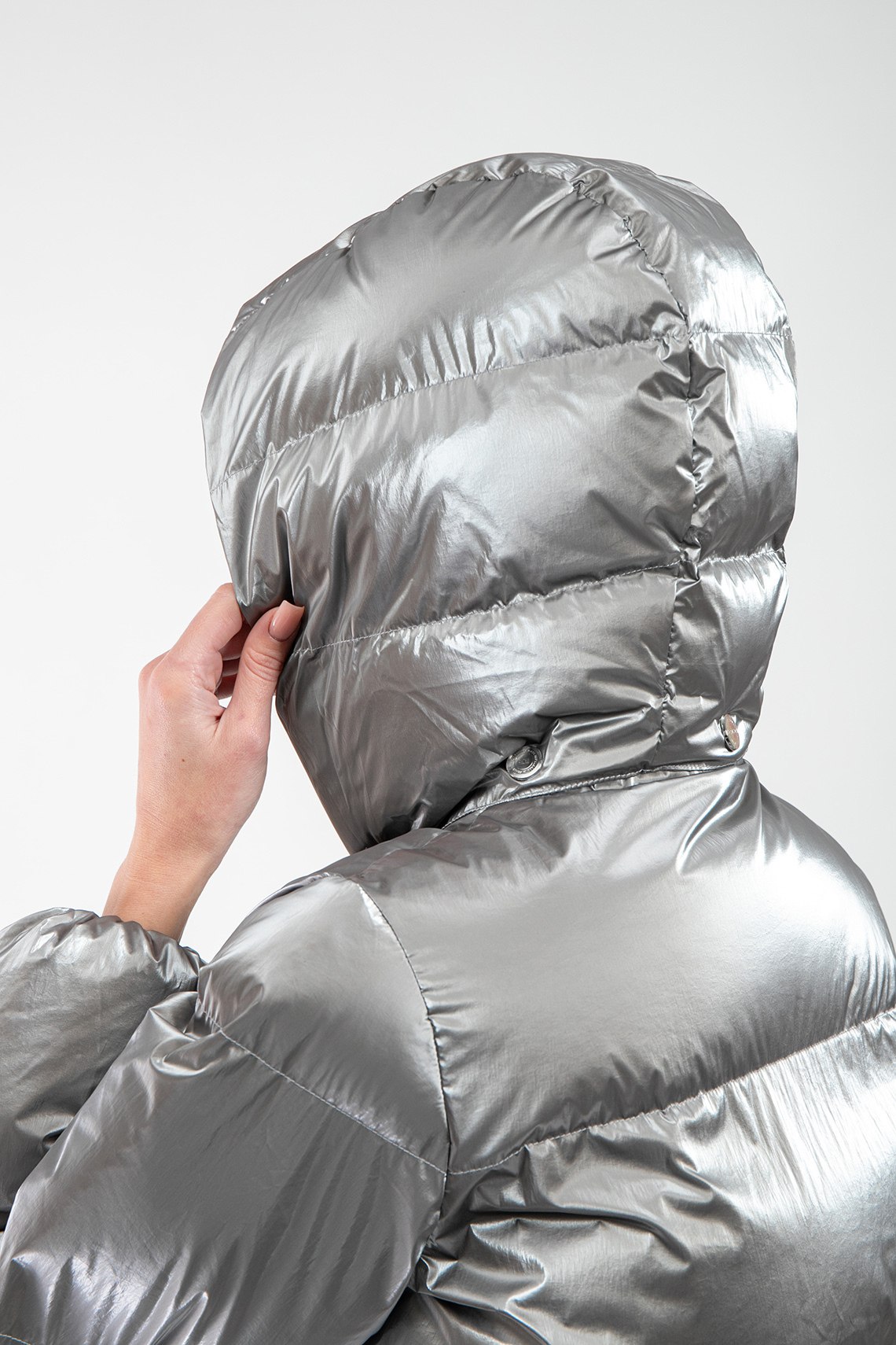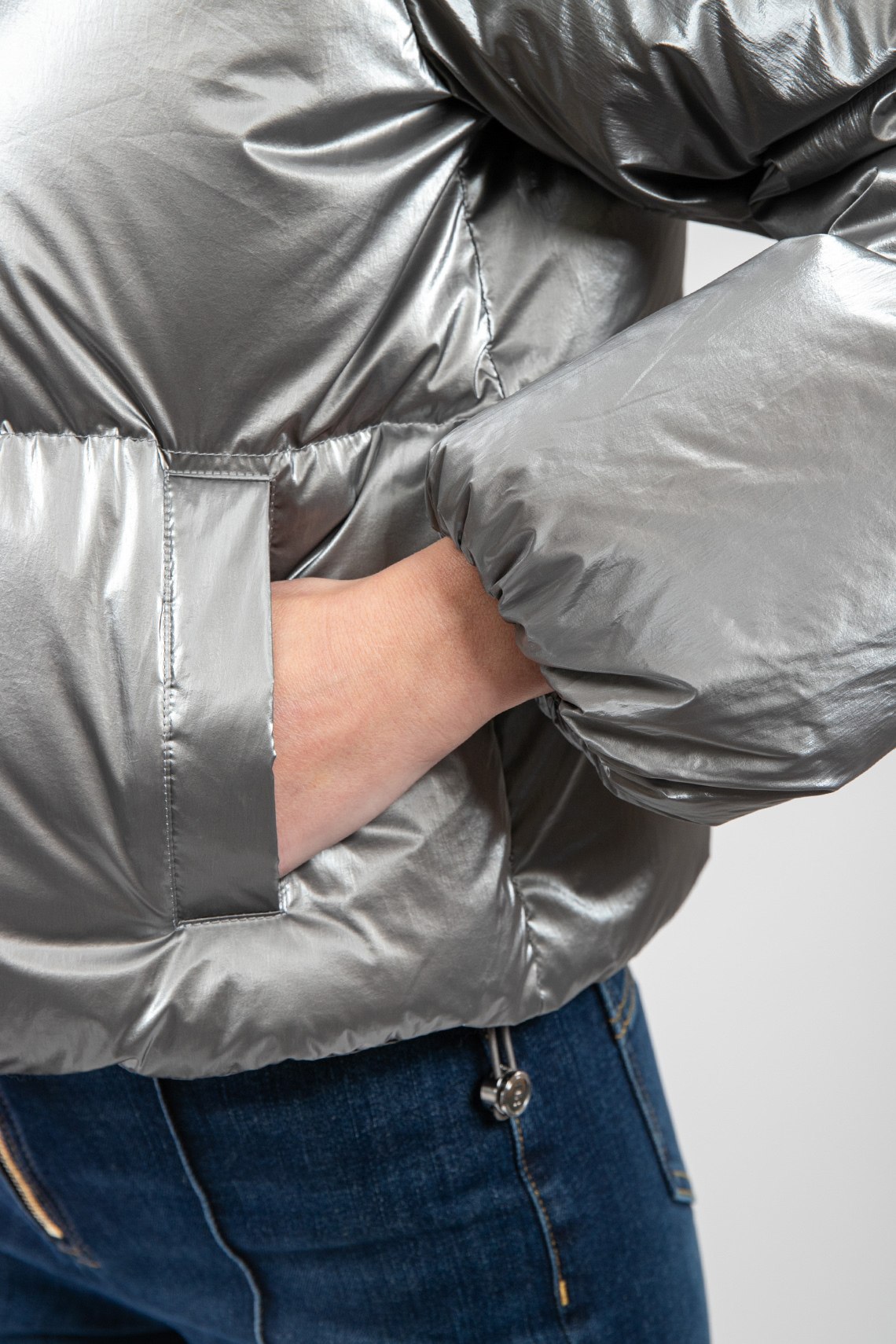 Женская серебристая утепленная куртка от Elisabetta Franchi (Елизабетта Франчи). Стеганый дизайн, съемный капюшон, высокий воротник, боковые карманы, застежка на молнию и кнопки, укороченная длина