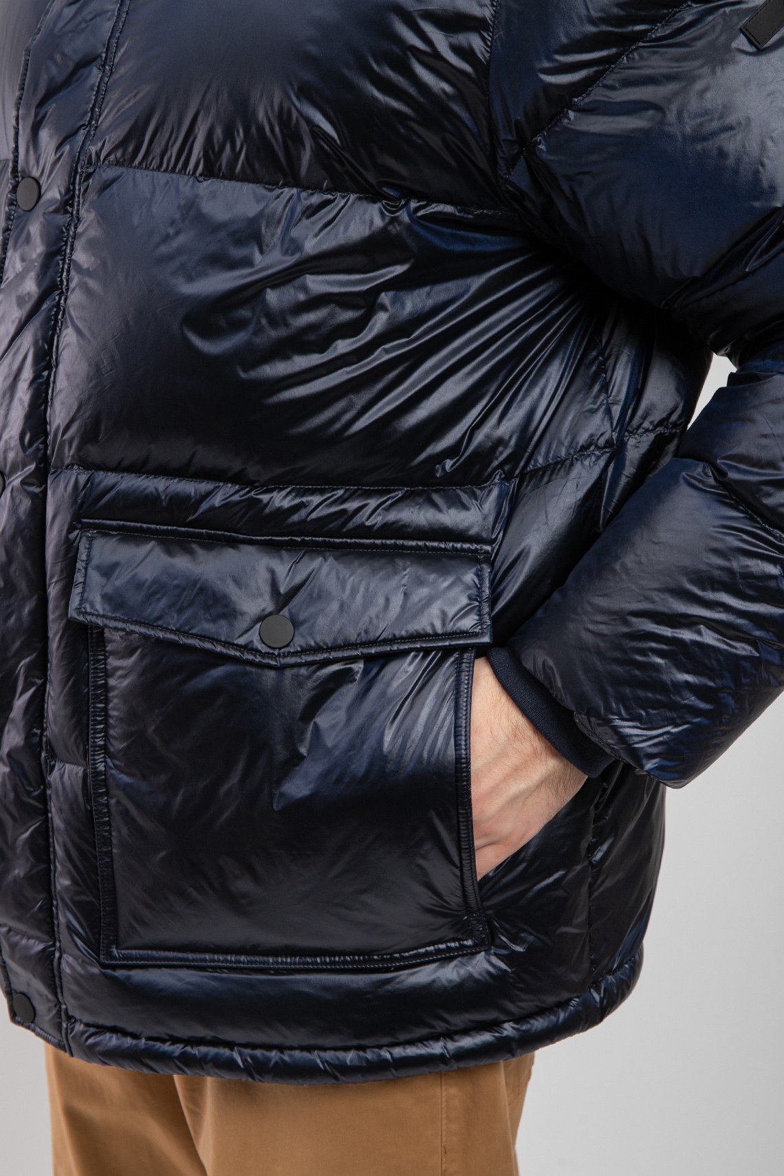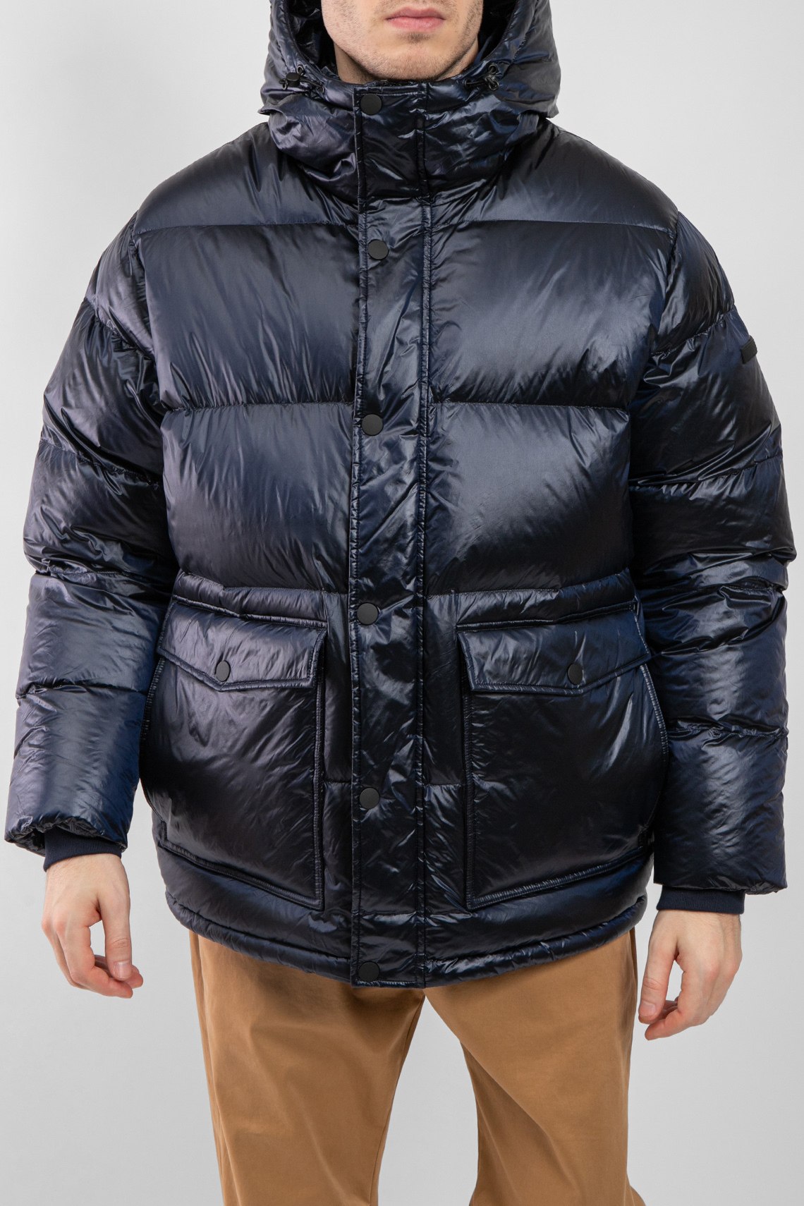 Мужская темно-синяя куртка из полиэстера от Armani (Армани). Стеганый дизайн, застежка на молнию и кнопки, высокий воротник-стойка, вшитый капюшон, четыре кармана, модель утепленная миксом из пуха и пера