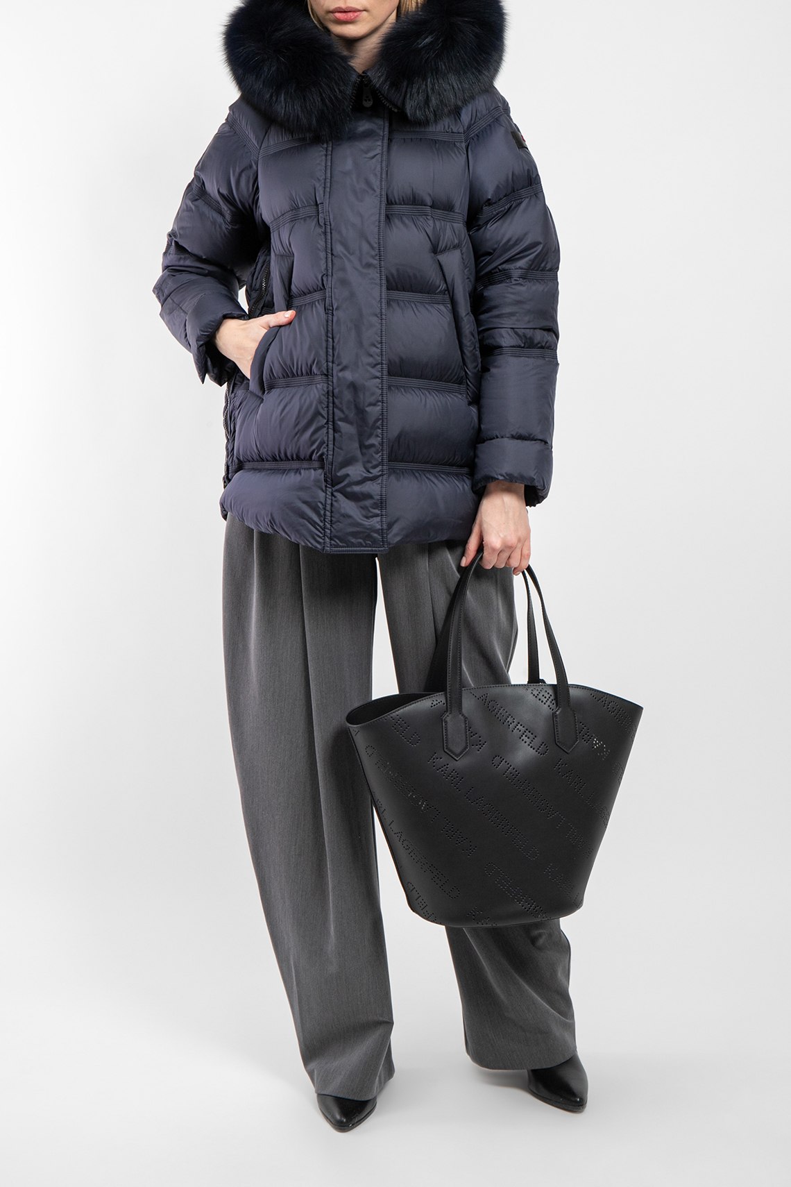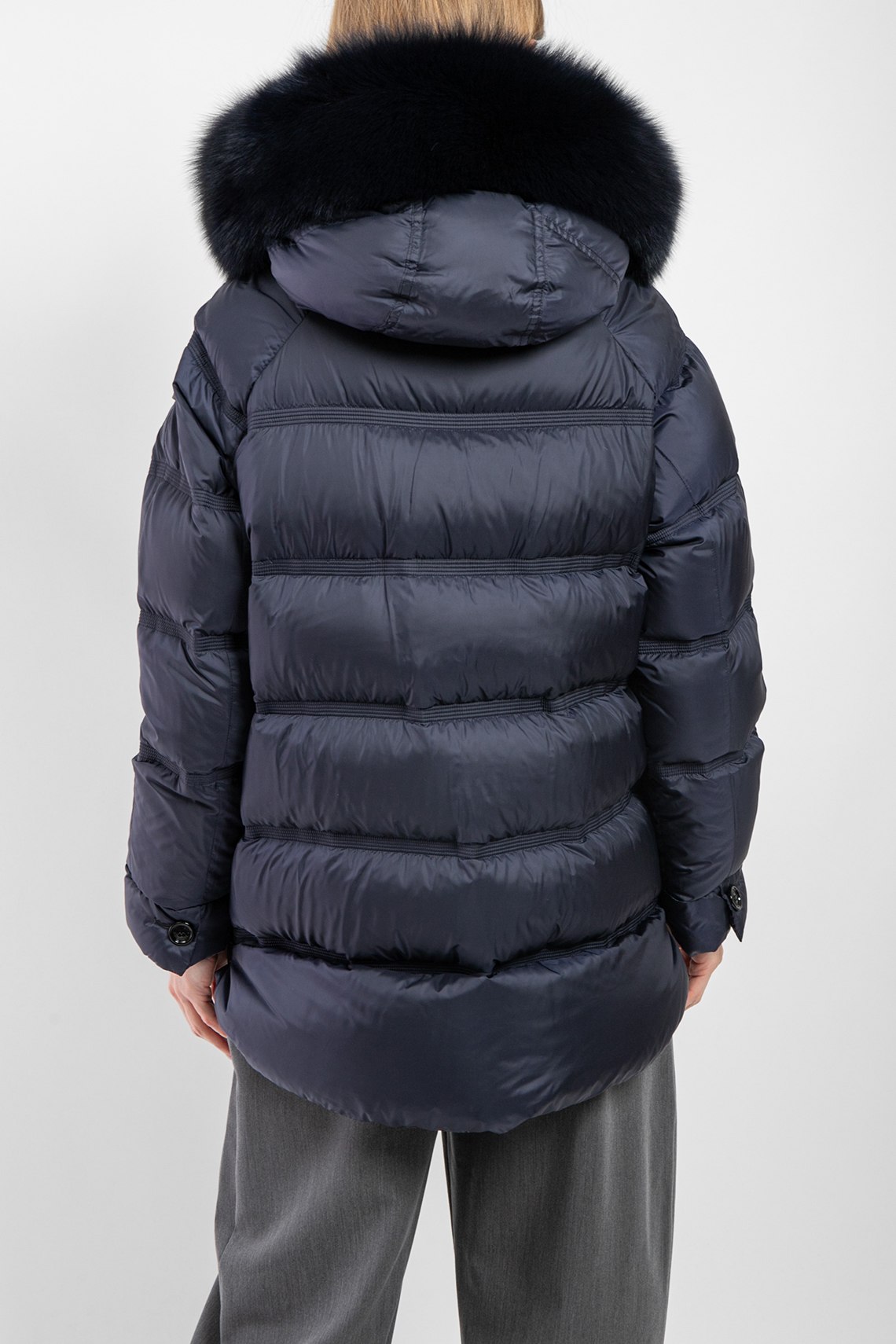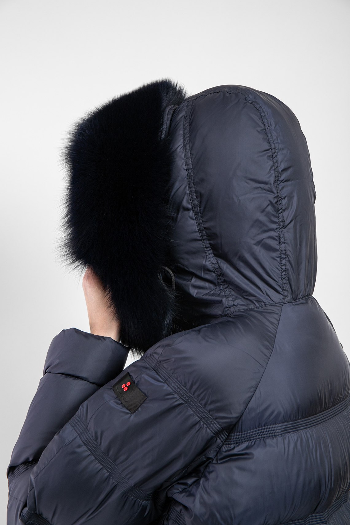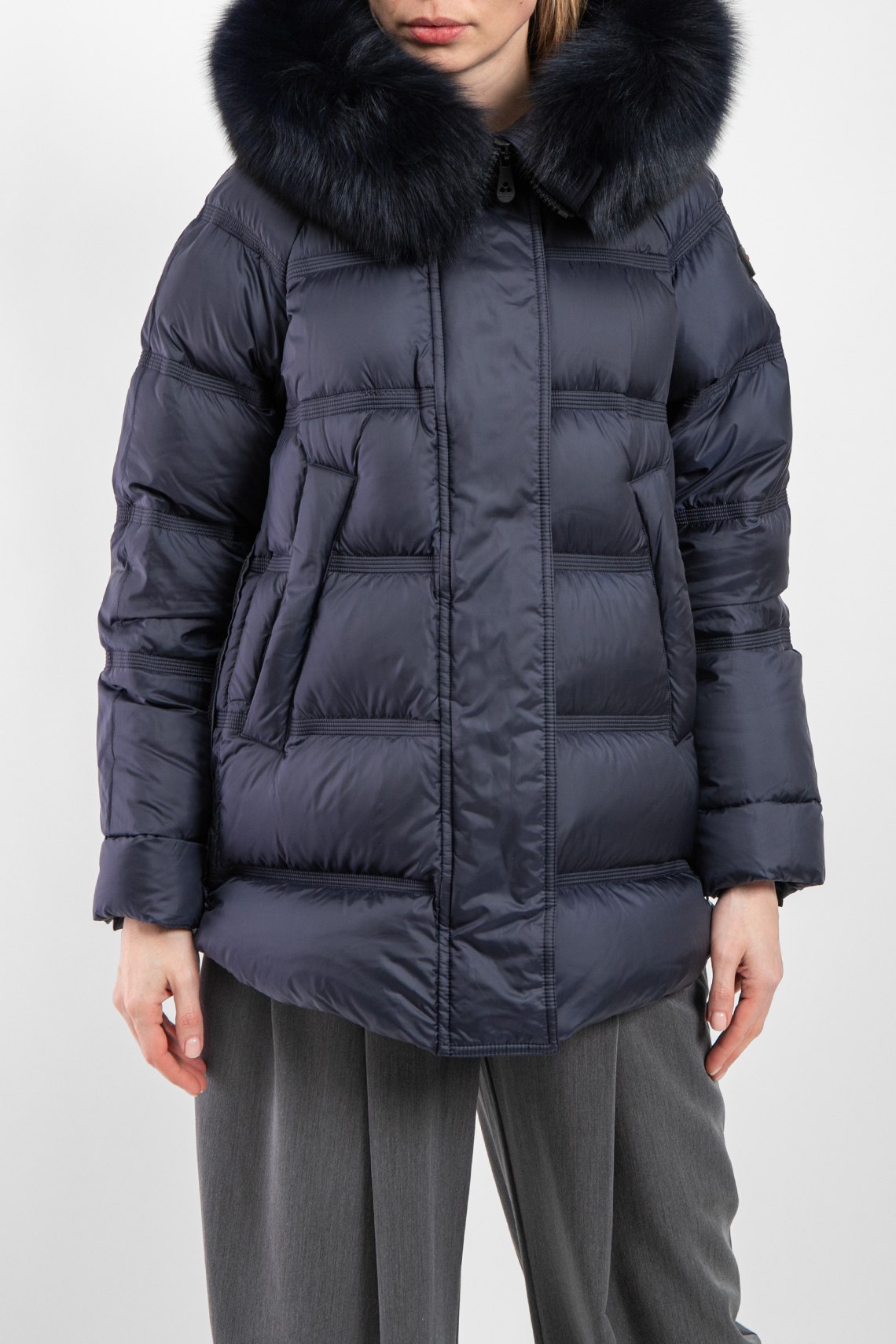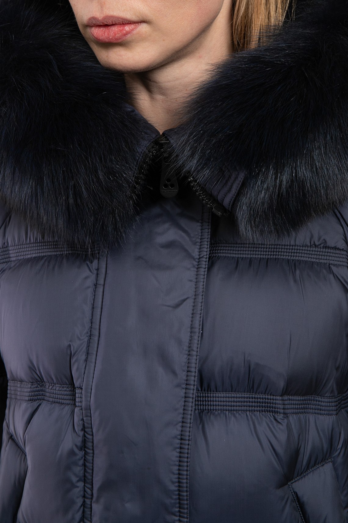 Женская темно-синяя куртка из полиэстера от Peuterey (Пьютерей). Стеганый дизайн, вшитый капюшон с меховой отделкой, застежка на молнию и кнопки, застежка-молния по бокам, фигурный низ изделия, модель утепленная миксом из пуха и пера, патч-лого