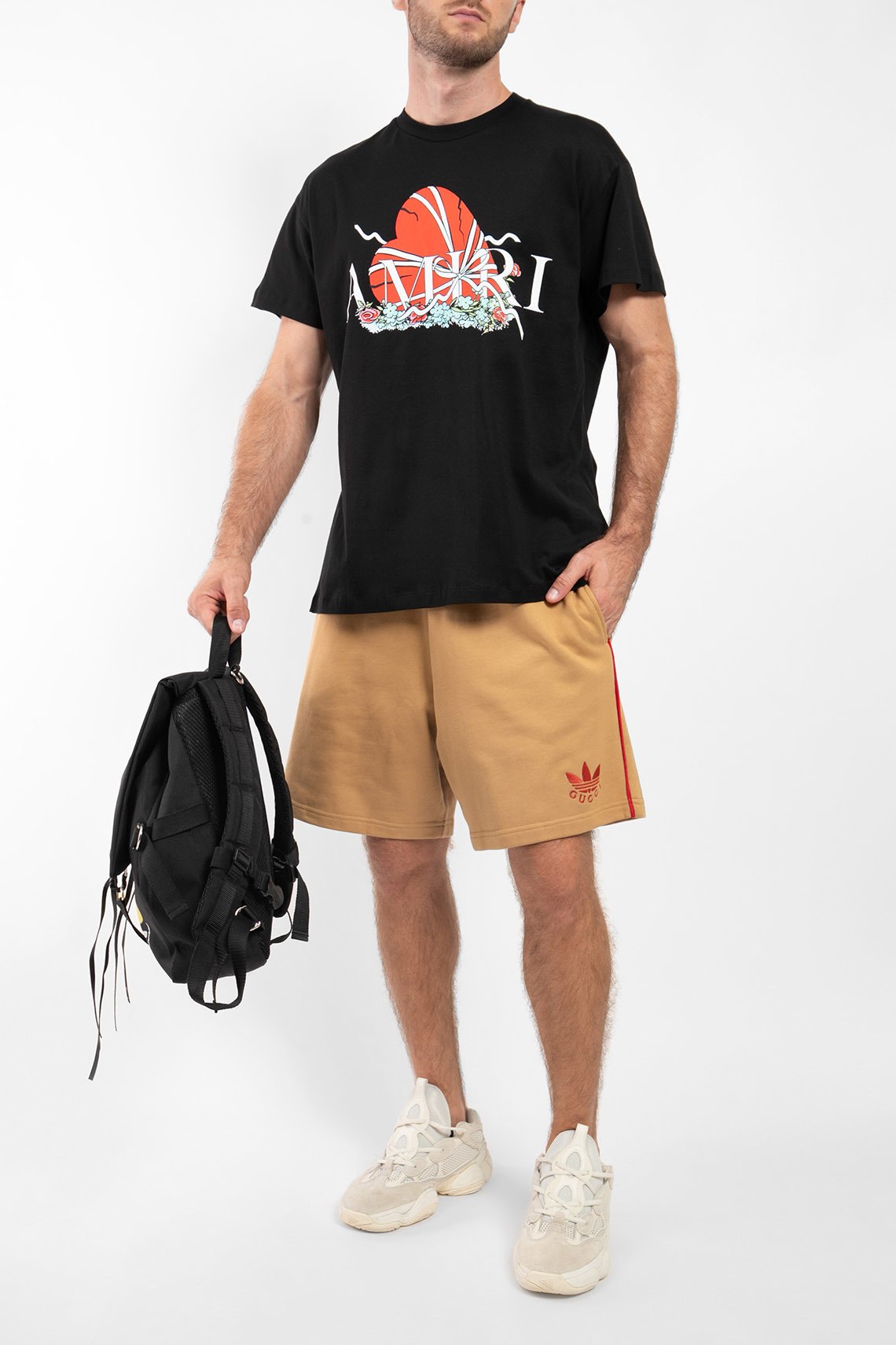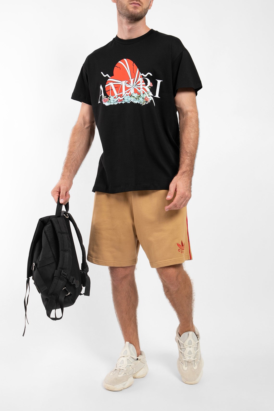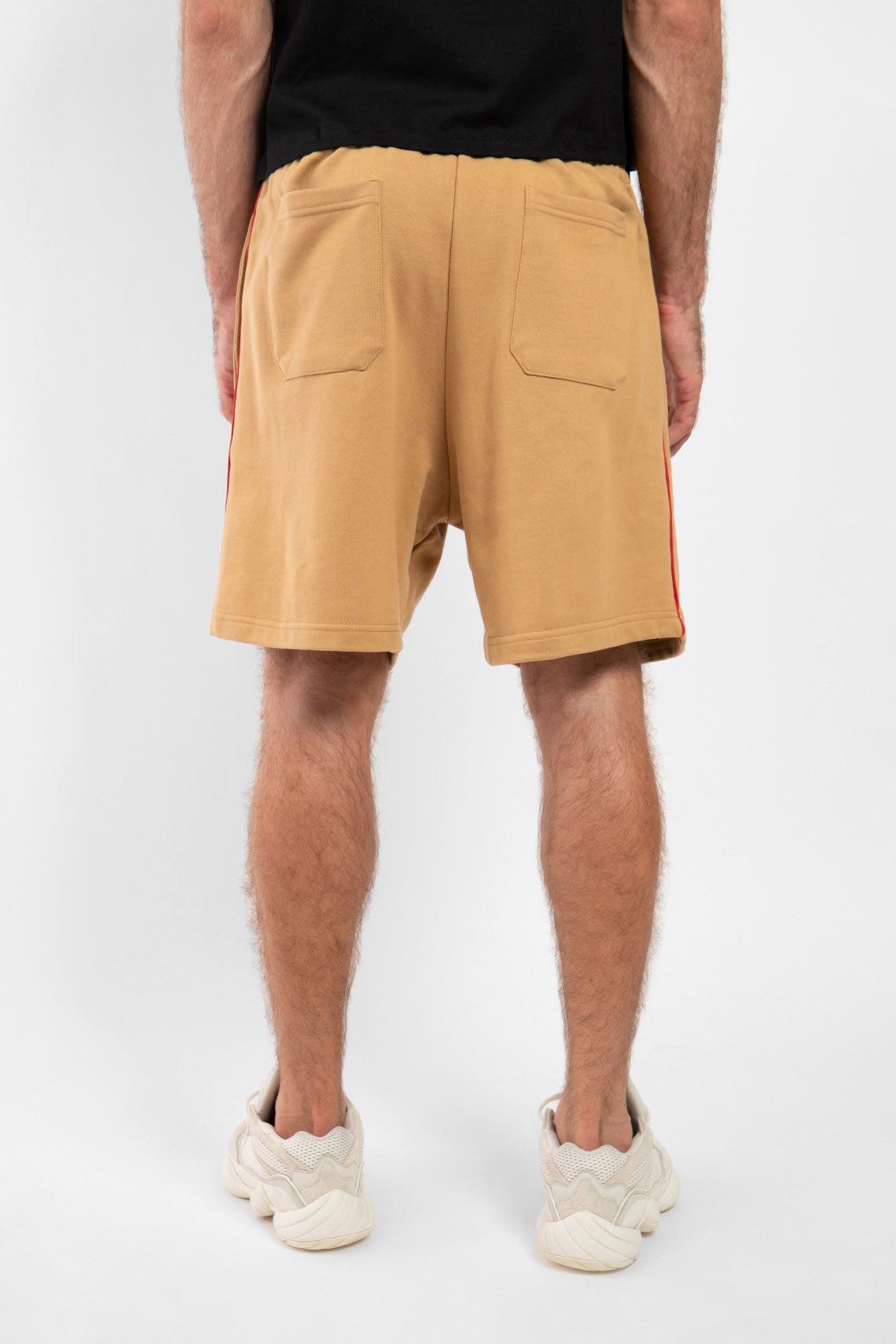 Мужские горчичные шорты из хлопка от Gucci (Гуччи). Модель из коллаборации Adidas x Gucci, длина до колена, эластичная резинка на поясе, прорезные карманы, контрастные лампасы, вышитый логотип бренда