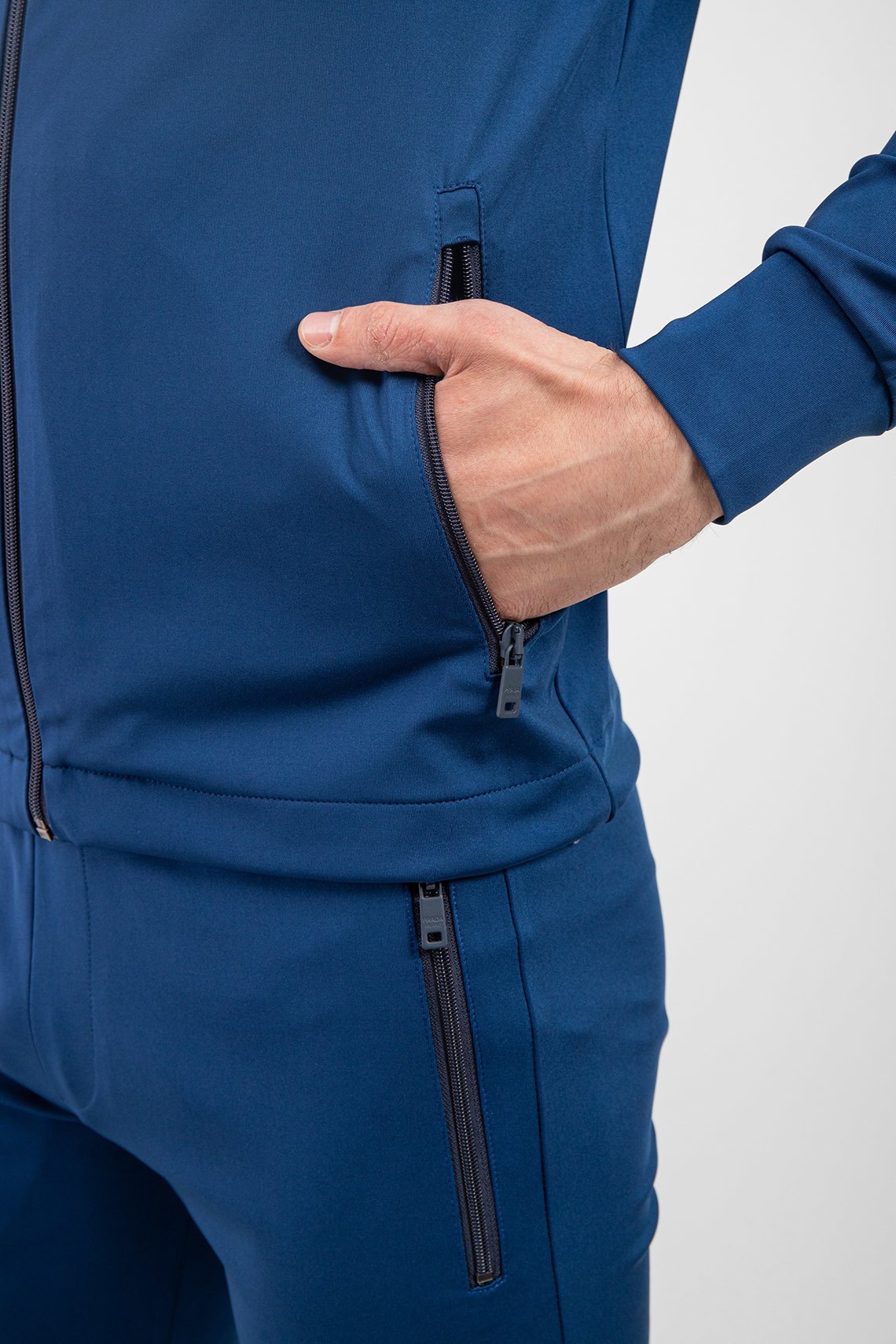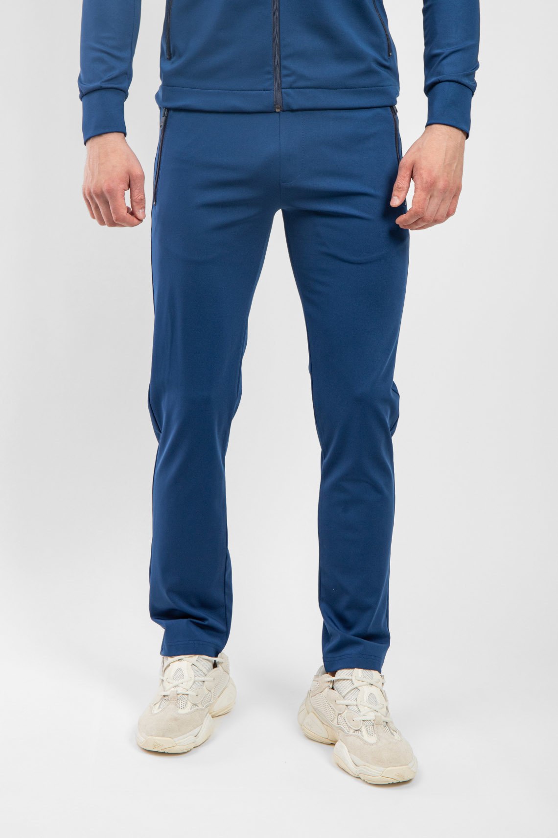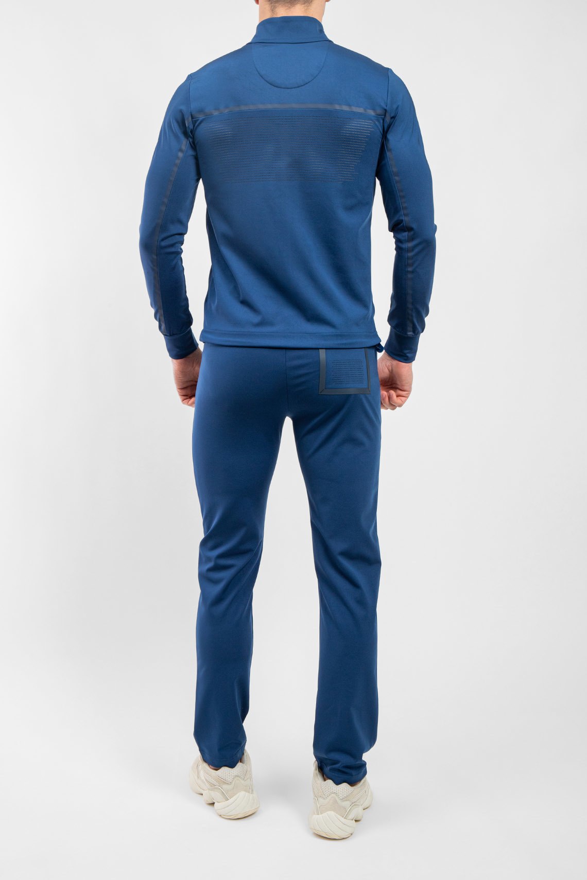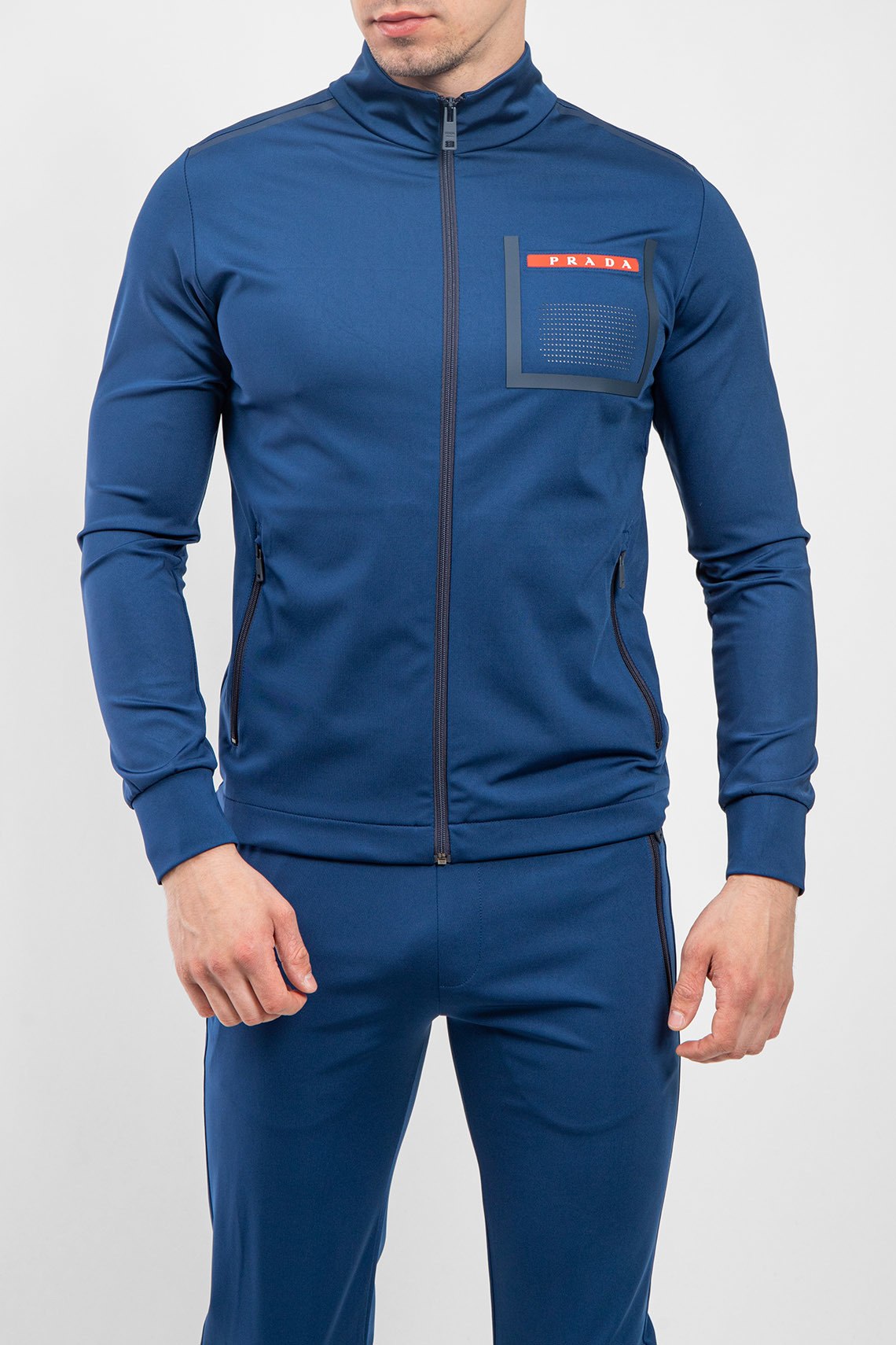 Мужской темно-синий спортивный костюм из полиэстера от Prada (Прада). Спортивная кофта на молнии, воротник-стойка, длинные рукава, брендированный принт на груди, боковые карманы на молнии, трикотажная резинка на манжетах и по низу изделия, Спортивные брюки прямого кроя, эластичная резинка на поясе с кулиской, прорезные карманы на молнии, логотип бренда