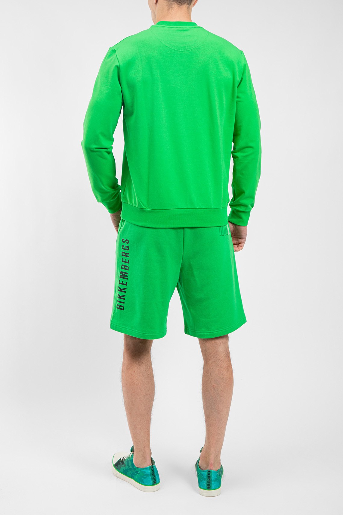 Мужской зеленый спортивный костюм из хлопкового микса от Bikkembergs (Биккембергс). Свитшот с логотипом бренда, круглый вырез горловины, длинные рукава, трикотажная резинка на манжетах и по низу изделия, шорты свободного кроя, эластичная резинка на поясе с кулиской, прорезные карманы, логотип бренда. Размер вещи на фото: L