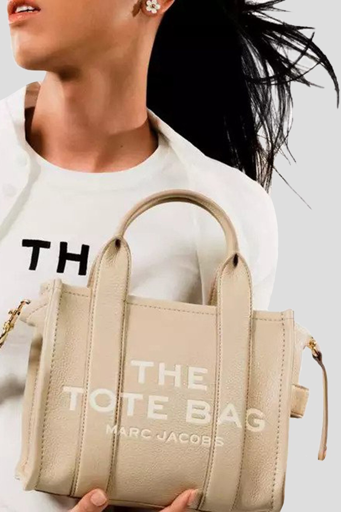 Женская бежевая сумка-тоут The Small Tote из натуральной кожи от Marc Jacobs (Марк Джейкобс). Одно отделение, застежка на молнию, внутренний карман на молнии, две ручки для носки в руках, съемный регулируемый плечевой ремень, логотип бренда. Измерения: 26 х 21 х 13 см, высота ручек: 11 см