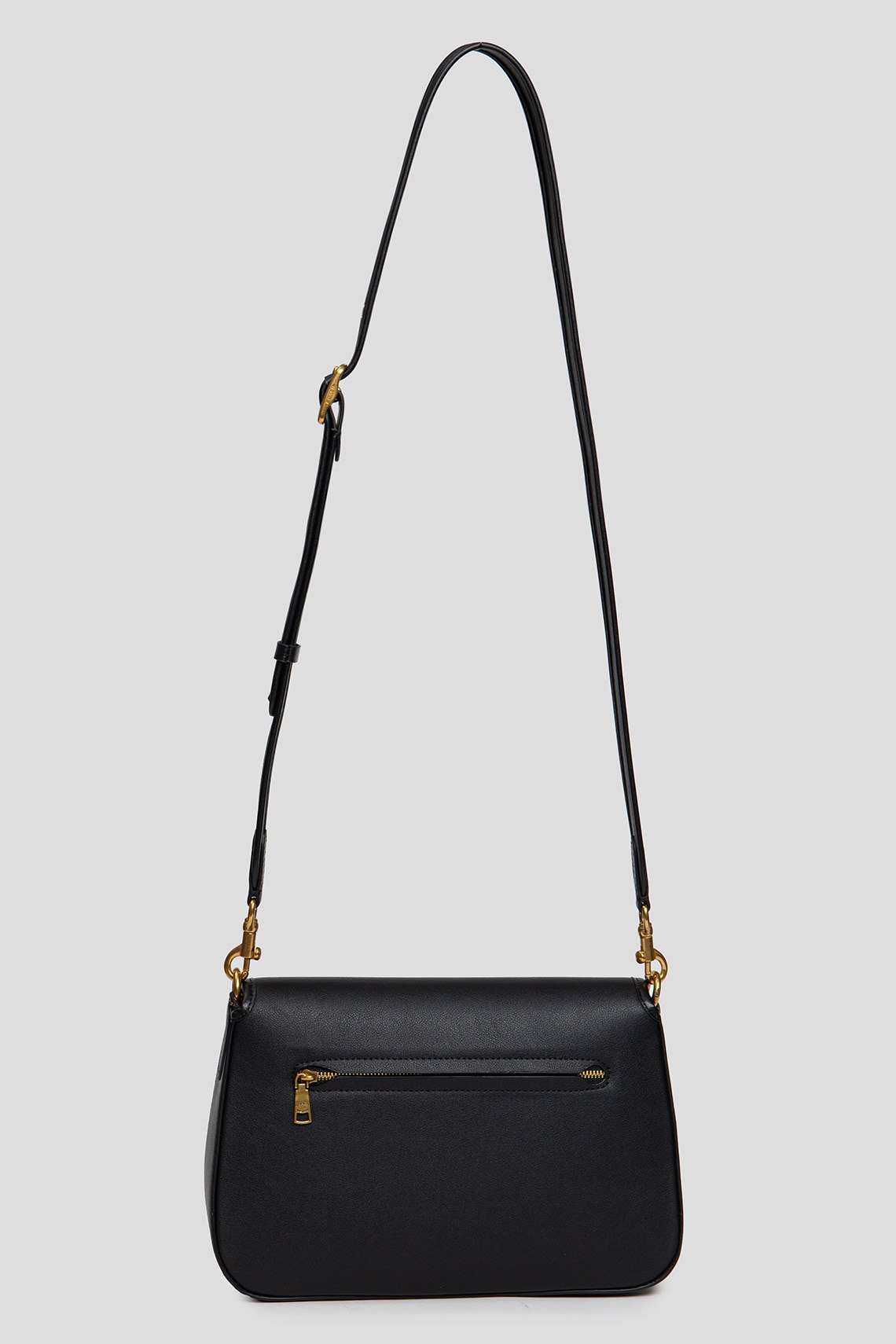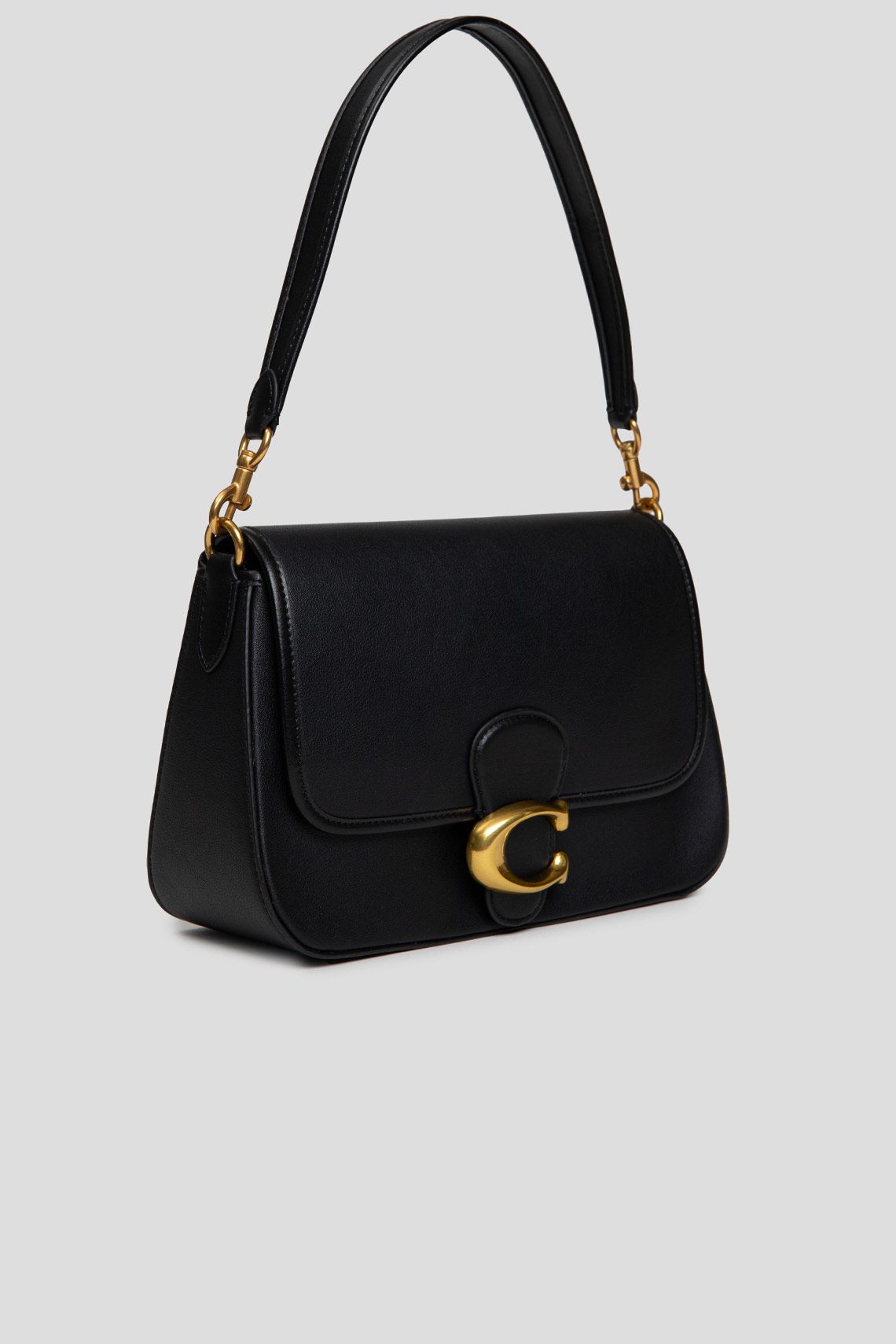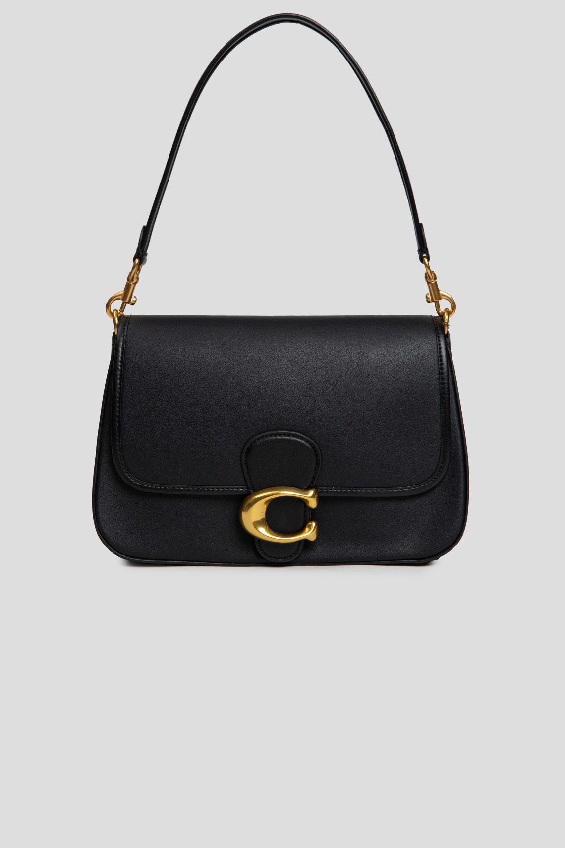 Женская черная кожаная сумка на плечо от Coach (Коуч). Модель из гладкой кожи, золотистая фурнитура, значок с логотипом, задний карман на молнии, застежка на магнит, два плечевых ремня короткий и длинный, одно отделение. Размеры: 27 х 18 х 8 см
