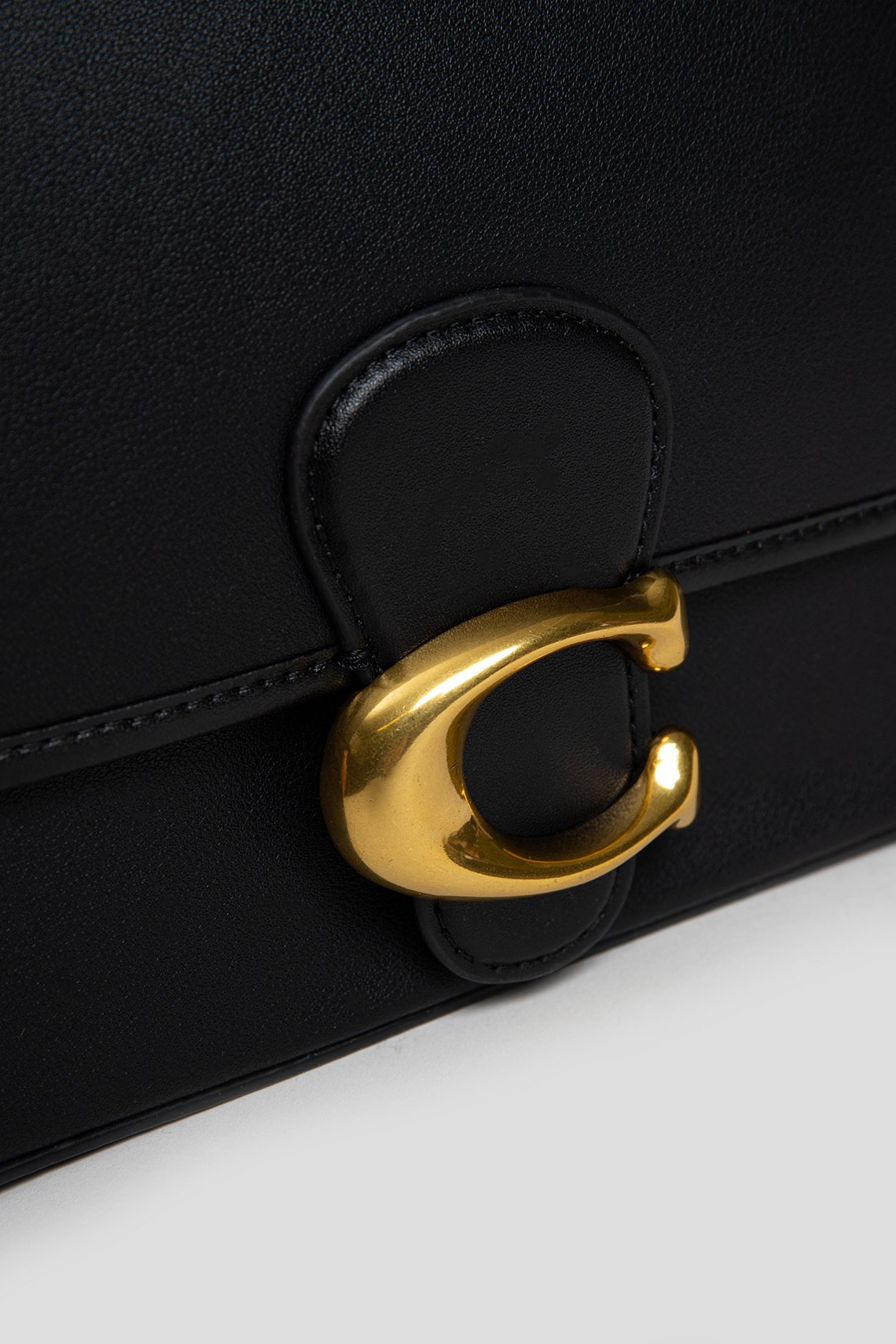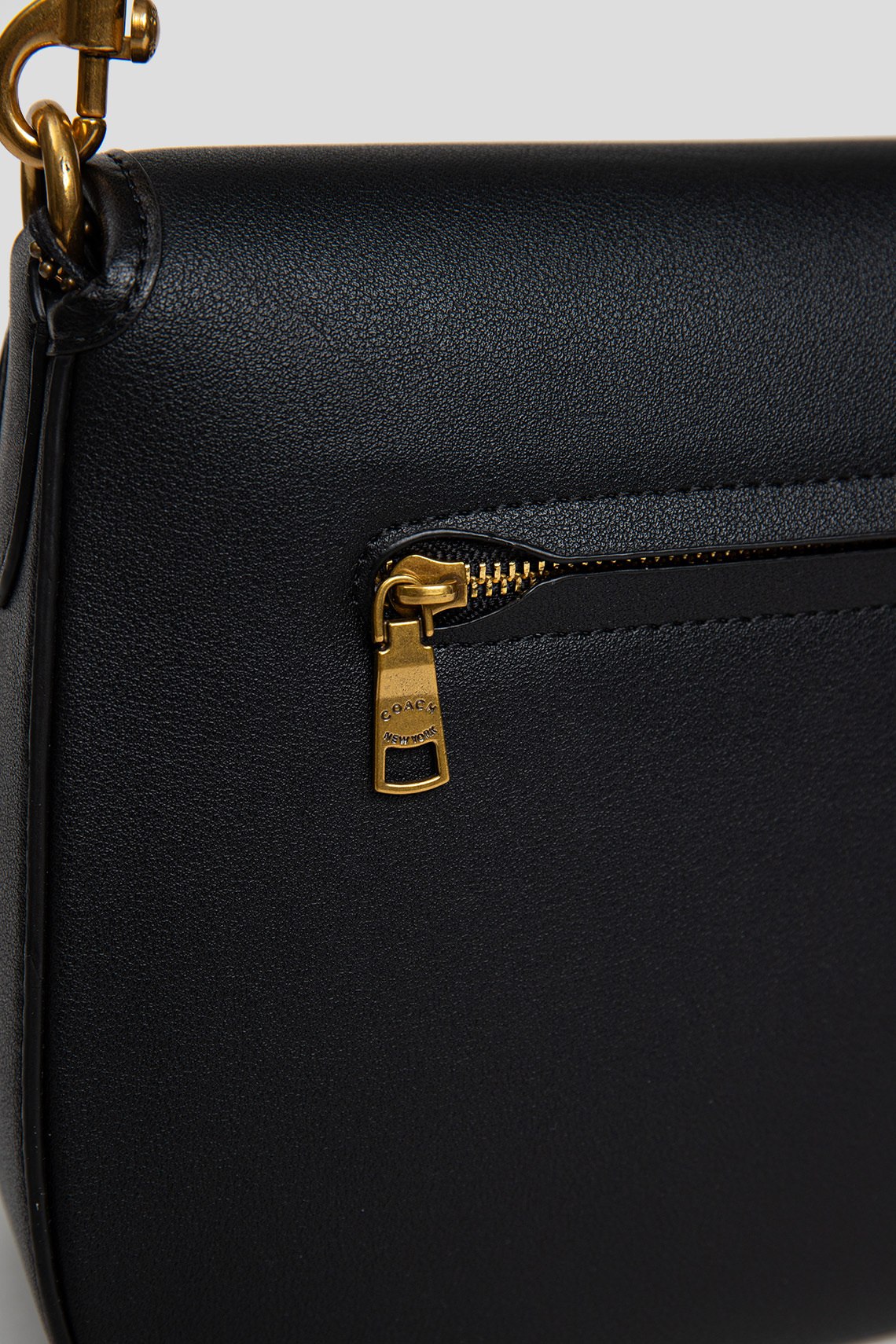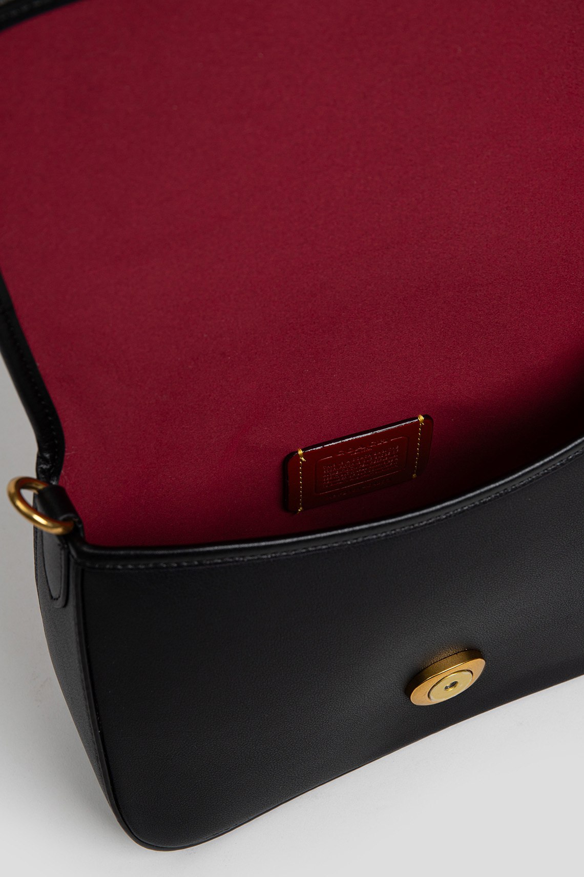 Женская черная кожаная сумка на плечо от Coach (Коуч). Модель из гладкой кожи, золотистая фурнитура, значок с логотипом, задний карман на молнии, застежка на магнит, два плечевых ремня короткий и длинный, одно отделение. Размеры: 27 х 18 х 8 см