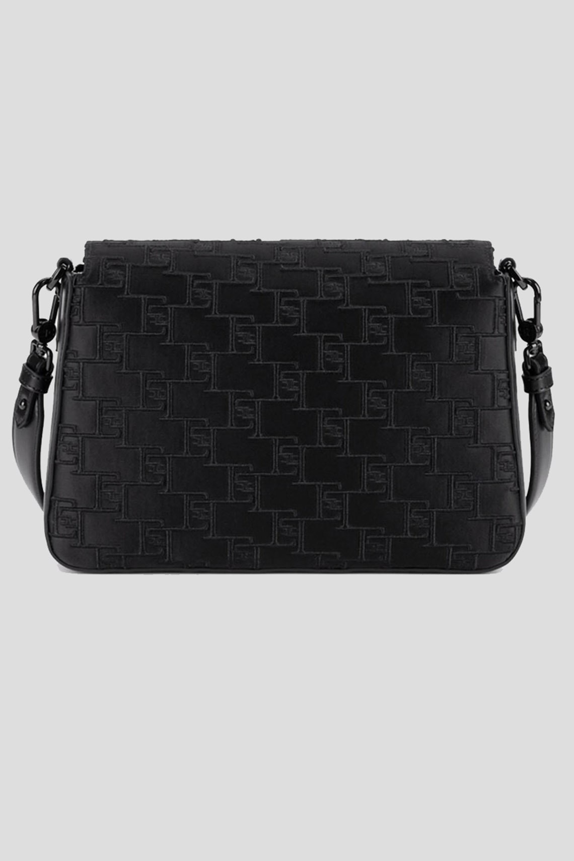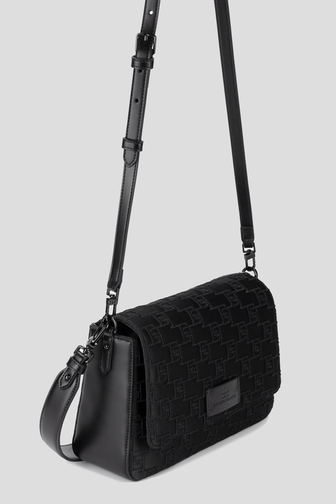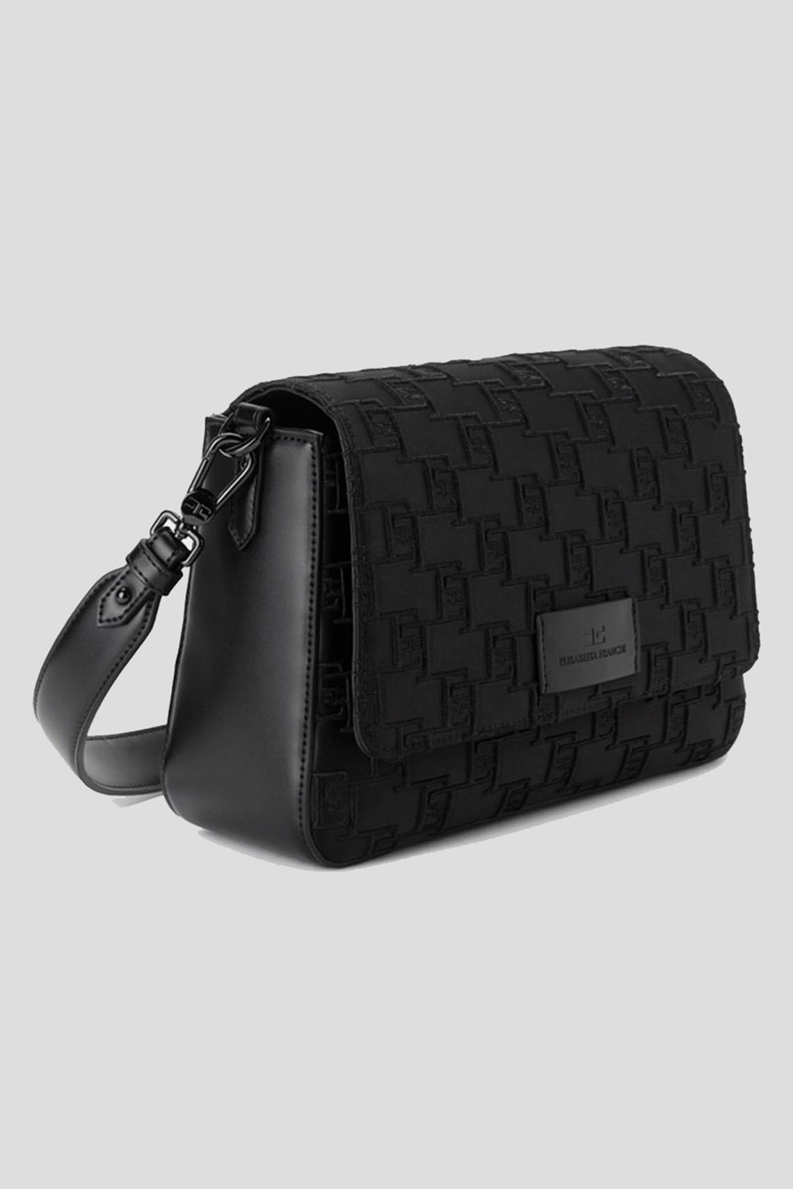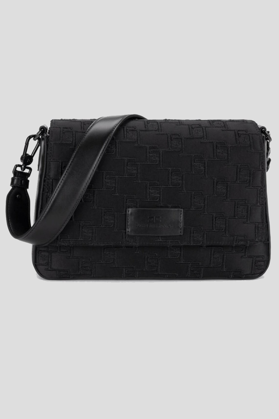Женская черная сумка кросс-боди из полиэстера от Elisabetta Franchi (Елизабетта Франчи). Модель с тиснением, одно отделение, застежка с клапаном на кнопку, патч-лого, ручка в руку, кожаный плечевой ремень. Размер: 26 x 17 x 8,5 см