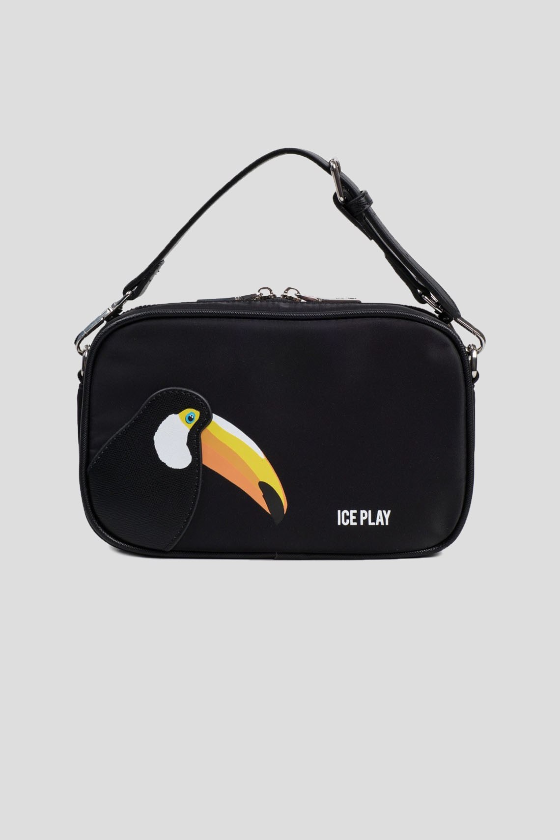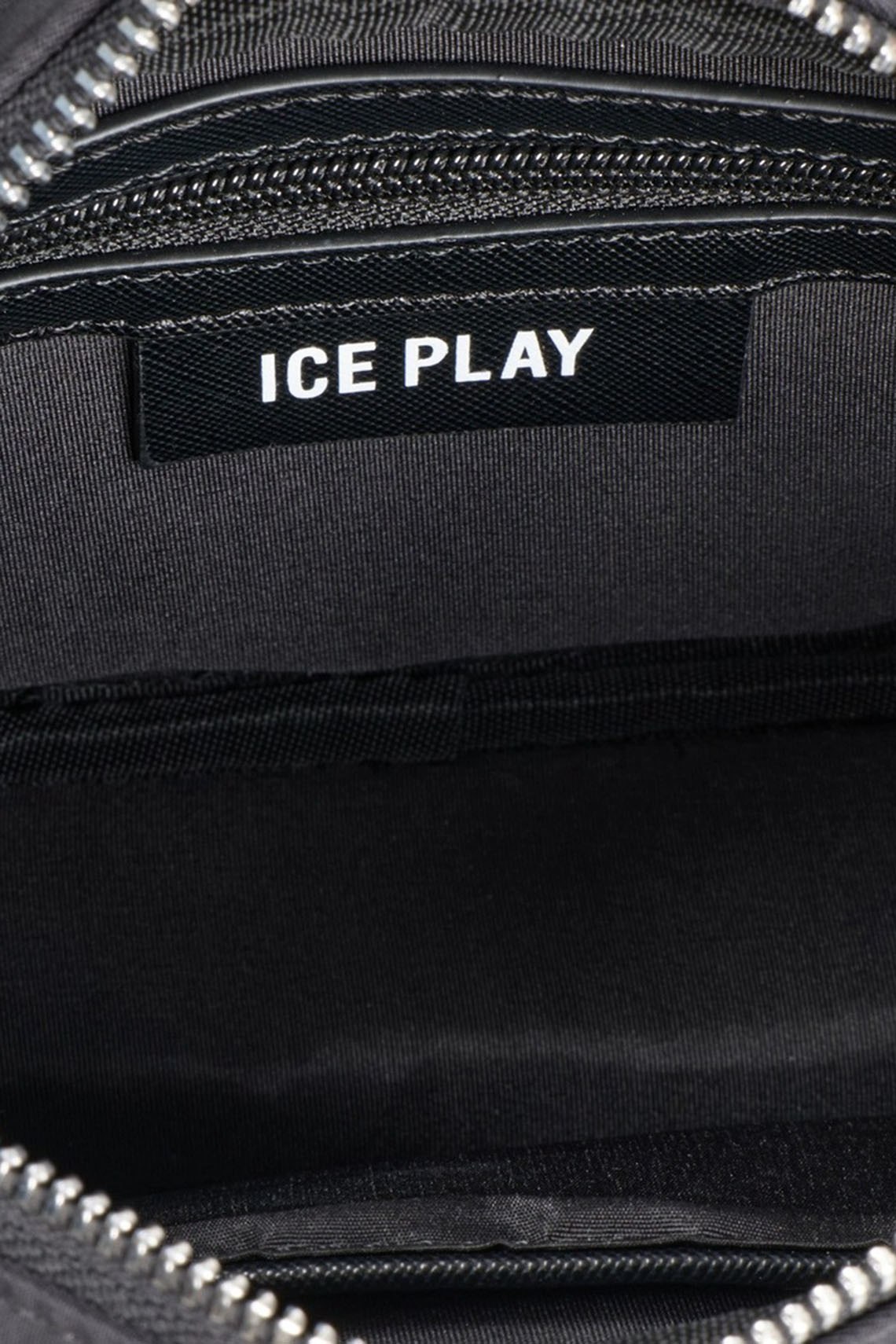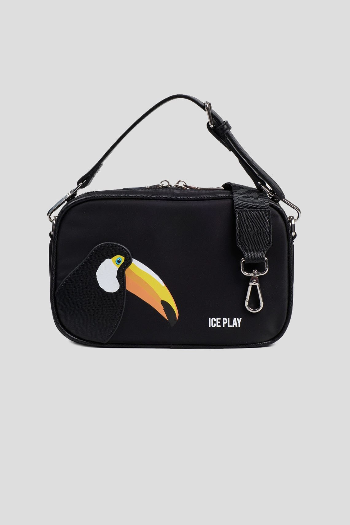 Женская черная текстильная сумка в руку от Ice Play (Айс Плей). Принт с логотипом, кожаная нашивка, круглая регулируемая ручка, застежка-молния, одно отделение. Размеры: высота: 16 см, ширина: 22 см, ширина по дну: 6 см