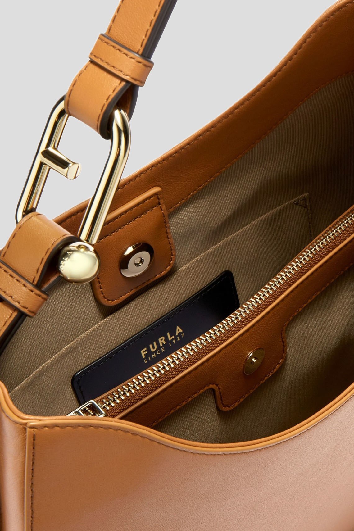 Женская коричневая сумка на плечо Nuvola из натуральной кожи от Furla (Фурла). Одно отделение, застежка на кнопку, карман на молнии, патч-лого, металлическая фурнитура, несъемная ручка на плечо. Размер: 39x27x10 см