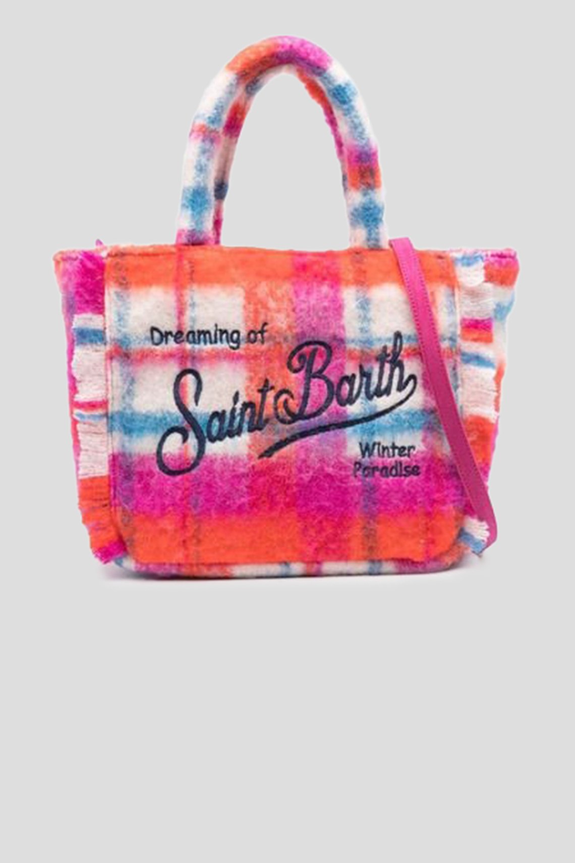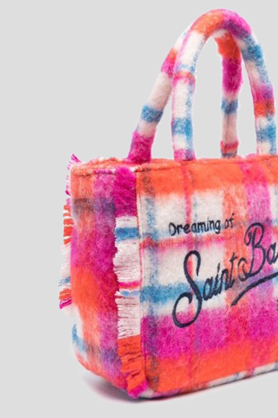 Женская разноцветная шерстяная сумка-тоут Colette от Mc2 Saint Barth (Mc2 Сент Барт). Клетка по всей поверхности, вышитый логотип, декор бахромой, две круглые ручки, съемный плечевой ремень, застежка-молния, одно отделение. Размеры: 29 x 25 x 14 см
